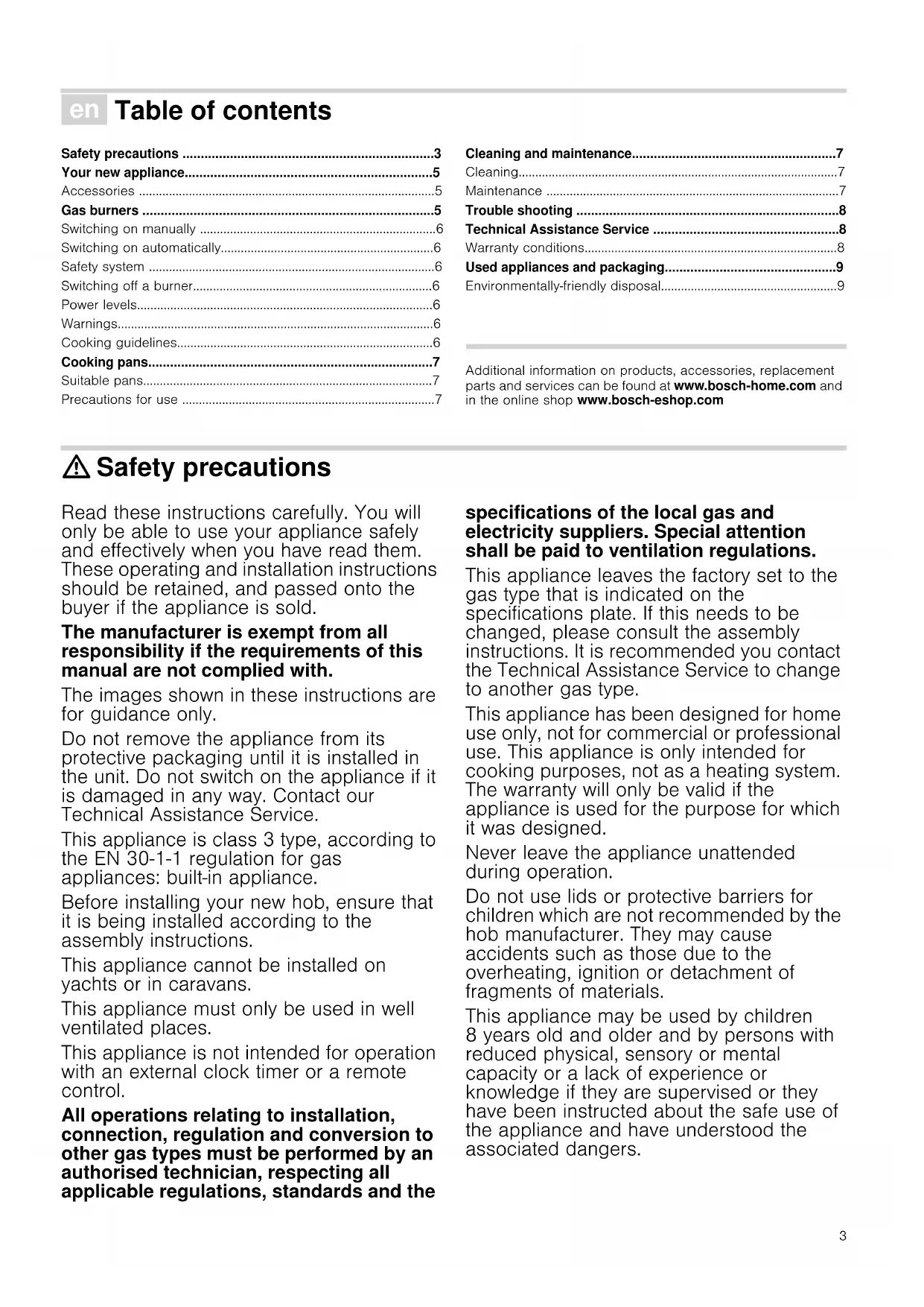 - Environmentally-friendly disposal Produktinfo Additional information on products, accessories, replacement parts and services can be found at www.bosch-home.com and in the online shop www.bosch-eshop.com : Safety precautions Read these instructions carefully. You will only be able to use your appliance safely and effectively when you have read them. These operating and installation instructions should be retained, and passed onto the buyer if the appliance is sold. The manufacturer is exempt from all responsibility if the requirements of this manual are not complied with. The images shown in these instructions are for guidance only. Do not remove the appliance from its protective packaging until it is installed in the unit. Do not switch on the appliance if it is damaged in any way. Contact our Technical Assistance Service. This appliance is class 3 type, according to the EN 30-1-1 regulation for gas appliances: built-in appliance. Before installing your new hob, ensure that it is being installed according to the assembly instructions. This appliance cannot be installed on yachts or in caravans. This appliance must only be used in well ventilated places. This appliance is not intended for operation with an external clock timer or a remote control. All operations relating to installation, connection, regulation and conversion to other gas types must be performed by an authorised technician, respecting all applicable regulations, standards and the specifications of the local gas and electricity suppliers. Special attention shall be paid to ventilation regulations. This appliance leaves the factory set to the gas type that is indicated on the specifications plate. If this needs to be changed, please consult the assembly instructions. It is recommended you contact the Technical Assistance Service to change to another gas type. This appliance has been designed for home use only, not for commercial or professional use. This appliance is only intended for cooking purposes, not as a heating system. The warranty will only be valid if the appliance is used for the purpose for which it was designed. Never leave the appliance unattended during operation. Do not use lids or protective barriers for children which are not recommended by the hob manufacturer. They may cause accidents such as those due to the overheating, ignition or detachment of fragments of materials. This appliance may be used by children 8 years old and older and by persons with reduced physical, sensory or mental capacity or a lack of experience or knowledge if they are supervised or they have been instructed about the safe use of the appliance and have understood the associated dangers.4 Never let children play with the appliance. Cleaning and user maintenance must not be carried out by unsupervised children. Risk of deflagration! Accumulation of unburned gas in an enclosed area carries a risk of deflagration. Do not subject the appliance to draughts. These might blow out the burners. Carefully read the instructions and warnings on the operation of gas burners. Risk of poisoning! The kitchen will become hot and humid and combustion products produced when this gas appliance is used. Make sure the kitchen is well ventilated, particularly when the hob is in operation: either keep the natural ventilation apertures open, or install a ventilation system (extractor hood). Intense prolonged use of the appliance may require additional or more effective ventilation: open a window or increase the power of the ventilation system. Risk of burns! The hotplates and their immediate vicinity get very hot. Never touch the hot surfaces. Keep children under 8 years old well away from this appliance. Risk of fire! p. 9