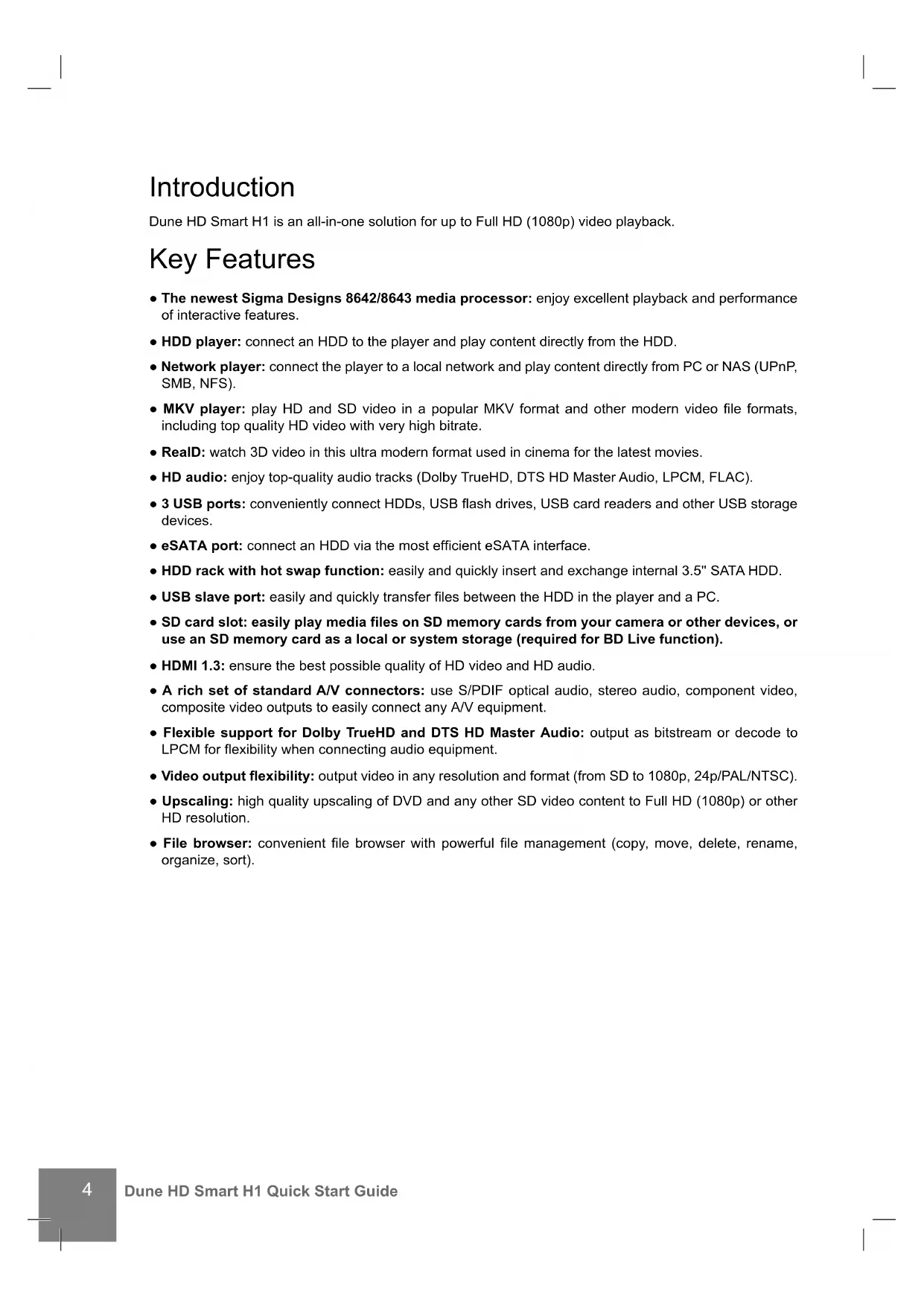 Короткий посібник Polski Skrócona instrukcja Szybki Start4 Dune HD Smart H1 Quick Start Guide Introduction Dune HD Smart H1 is an all-in-one solution for up to Full HD (1080p) video playback. Key Features ● The newest Sigma Designs 8642/8643 media processor: enjoy excellent playback and performance of interactive features. ● HDD player: connect an HDD to the player and play content directly from the HDD. ● Network player: connect the player to a local network and play content directly from PC or NAS (UPnP, SMB, NFS). ● MKV player: play HD and SD video in a popular MKV format and other modern video file formats, including top quality HD video with very high bitrate. ● RealD: watch 3D video in this ultra modern format used in cinema for the latest movies. ● HD audio: enjoy top-quality audio tracks (Dolby TrueHD, DTS HD Master Audio, LPCM, FLAC). ● 3 USB ports: conveniently connect HDDs, USB flash drives, USB card readers and other USB storage devices. ● eSATA port: connect an HDD via the most efficient eSATA interface. ● HDD rack with hot swap function: easily and quickly insert and exchange internal 3.5'' SATA HDD. ● USB slave port: easily and quickly transfer files between the HDD in the player and a PC. ● SD card slot: easily play media files on SD memory cards from your camera or other devices, or use an SD memory card as a local or system storage (required for BD Live function). ● HDMI 1.3: ensure the best possible quality of HD video and HD audio. ● A rich set of standard A/V connectors: use S/PDIF optical audio, stereo audio, component video, composite video outputs to easily connect any A/V equipment. ● Flexible support for Dolby TrueHD and DTS HD Master Audio: output as bitstream or decode to LPCM for flexibility when connecting audio equipment. ● Video output flexibility: output video in any resolution and format (from SD to 1080p, 24p/PAL/NTSC). ● Upscaling: high quality upscaling of DVD and any other SD video content to Full HD (1080p) or other HD resolution. ● File browser: convenient file browser with powerful file management (copy, move, delete, rename, organize, sort).5 Extra Functions ● High-quality music playback: play very high-quality (up to 192 Khz / 24-bit) music files in various formats (FLAC, Monkey’s Audio APE, WAV/PCM, DTS, etc). ● Playlists: build playlists from your folders, use your own playlists, use repeat and shuffle functions. ● NAS function: access files on storage devices (HDD, optical drive, etc) attached to the player from the local network (using SMB or FTP). ● BitTorrent: use built-in BitTorrent client to download files from P2P networks. ● Customizable user interface: work with media collections using cover art and icon browsing (with Full HD graphics). ● Flash applications: extend the player functionality with FlashLite applications. ● Internet radio: playback and record various Internet radio stations (HTTP/MP3). ● IPTV: playback and record IPTV streams (multicast UDP/RTP) from your Internet provider*. ● Digital TV option: playback and record Digital TV channels using an optional Digital TV USB dongle**. ● Internet browsing: view Internet Web sites on your TV using the built-in Web browser***.