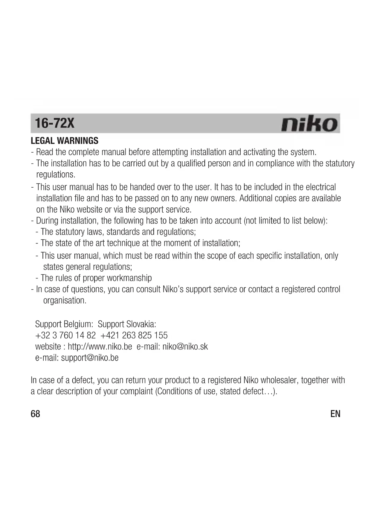 In case of a defect, you can return your product to a registered Niko wholesaler, together with a clear description of your complaint (Conditions of use, stated defect...).