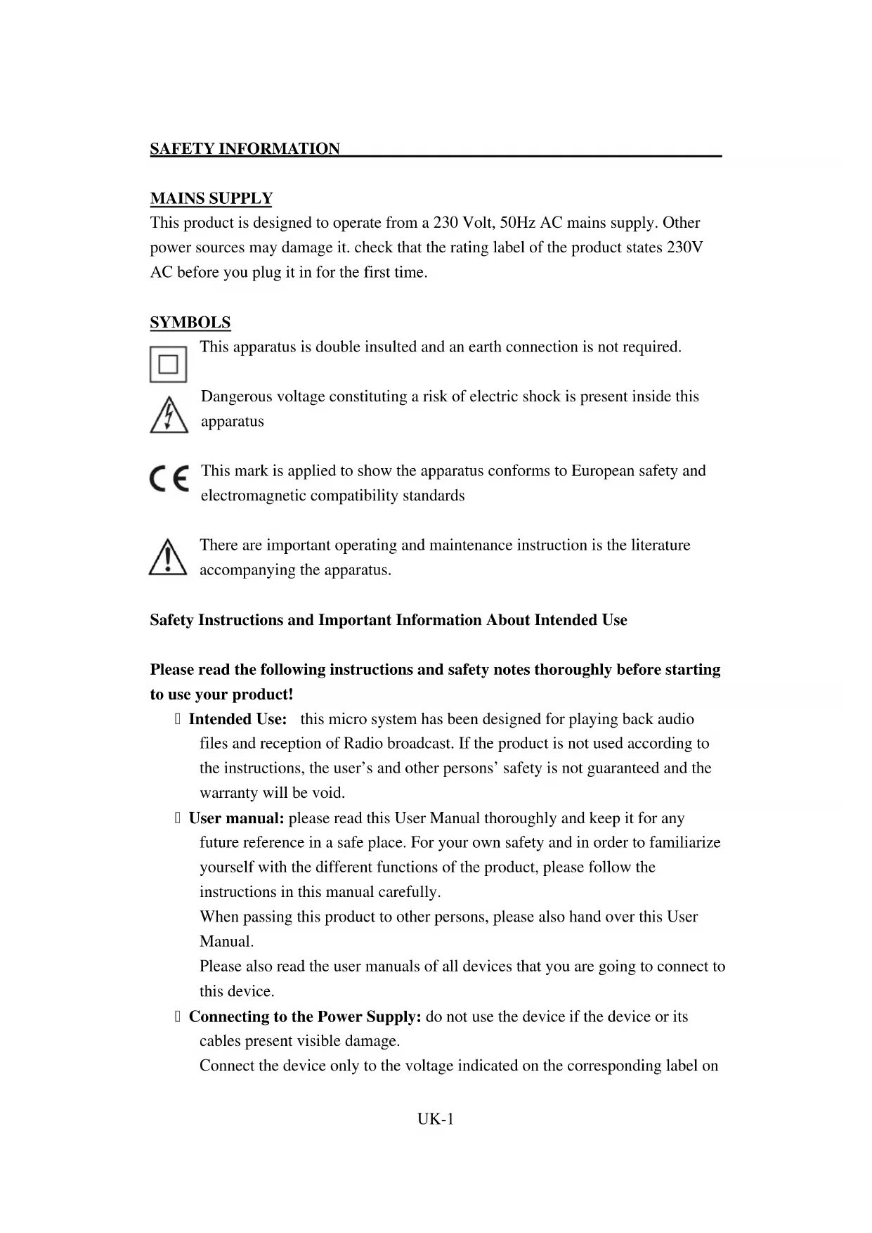 Intended Use: this micro system has been designed for playing back audio files and reception of Radio broadcast. If the product is not used according to the instructions, the user's and other persons' safety is not guaranteed and the warranty will be void.