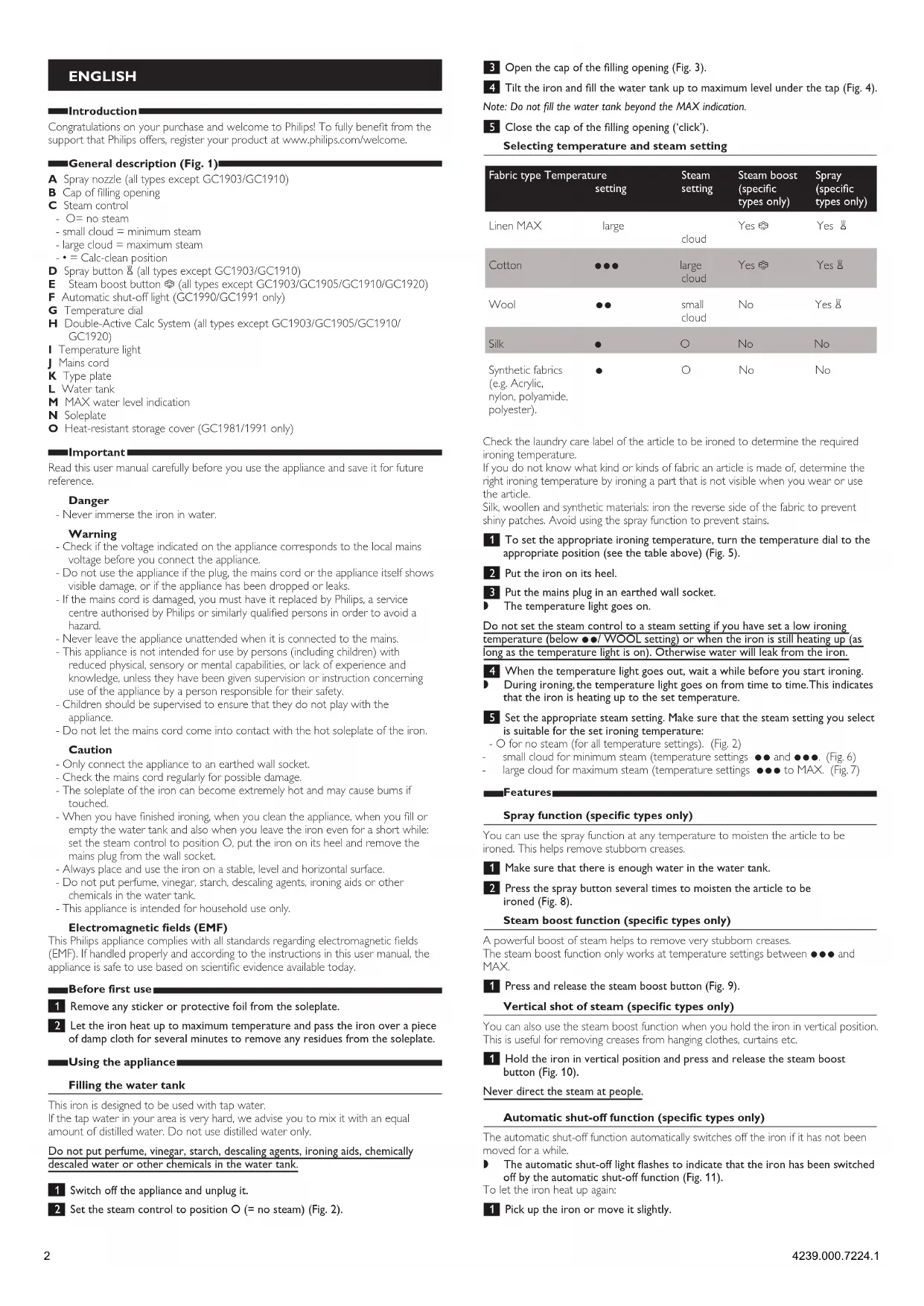 - O for no steam (for all temperature settings). (Fig. 2)