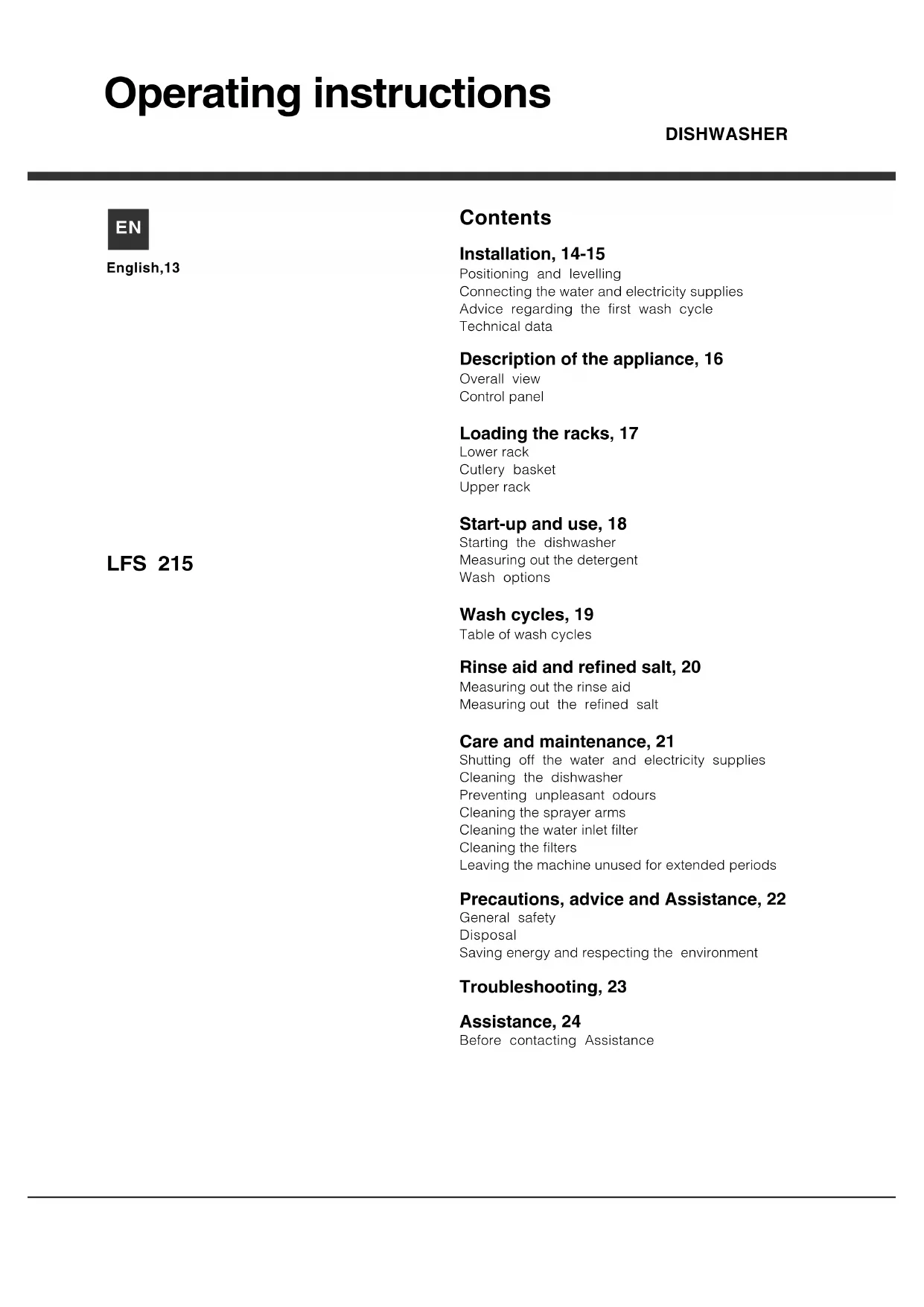 LFS 215 A BKHA - Dishwasher HOTPOINT ARISTON - Free user manual and instructions