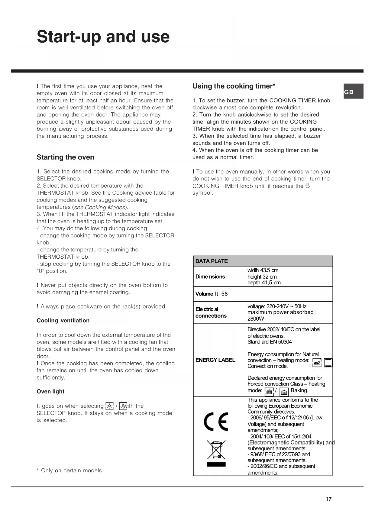3. When lit, the THERMOSTAT indicator light indicatesthat the oven is heating up to the temperature set.4. You may do the following during cooking:- change the cooking mode by turning the SELECTORknob.- change the temperature by turning theTHERMOSTAT knob.- stop cooking by turning the SELECTOR knob to the“0” position.! Never put objects directly on the oven bottom toavoid damaging the enamel coating.! Always place cookware on the rack(s) provided.Cooling ventilationIn order to cool down the external temperature of theoven, some models are fitted with a cooling fan thatblows out air between the control panel and the ovendoor.! Once the cooking has been completed, the coolingfan remains on until the oven has cooled downsufficiently.Oven lightIt goes on when selecting / with theSELECTOR knob. It stays on when a cooking modeis selected. Using the cooking timer* 1. To set the buzzer, turn the COOKING TIMER knobclockwise almost one complete revolution.2. Turn the knob anticlockwise to set the desiredtime: align the minutes shown on the COOKINGTIMER knob with the indicator on the control panel.3. When the selected time has elapsed, a buzzersounds and the oven turns off.4. When the oven is off the cooking timer can beused as a normal timer.! To use the oven manually, in other words when youdo not wish to use the end of cooking timer, turn theCOOKING TIMER knob until it reaches the 9symbol.DATA PLATE Dime nsions width 43.5 cm height 32 cm depth 41,5 cm Volume lt. 58 Ele ctric al connections voltage: 220-240V ~ 50Hz maximum power absorbed 2800W ENERGY LABEL Directive 2002/ 40/EC on the label of electric ovens. Stand ard EN 50304 Energy consumption for Natural convection – heating mode: / Convect ion mode. Declared energy consumption for Forced convection Class – heating mode: / Baking. This appliance conforms to the foll owing European Economic Community directives: - 2006/ 95/EEC o f 12/12/ 06 (L ow Voltage) and subsequent amendments; - 2004/ 108/ EEC of 15/1 2/04 (Electromagnetic Compatibility) and subsequent amendments; - 93/68/ EEC of 22/07/93 and subsequent amendments. - 2002/96/EC and subsequent amendments.