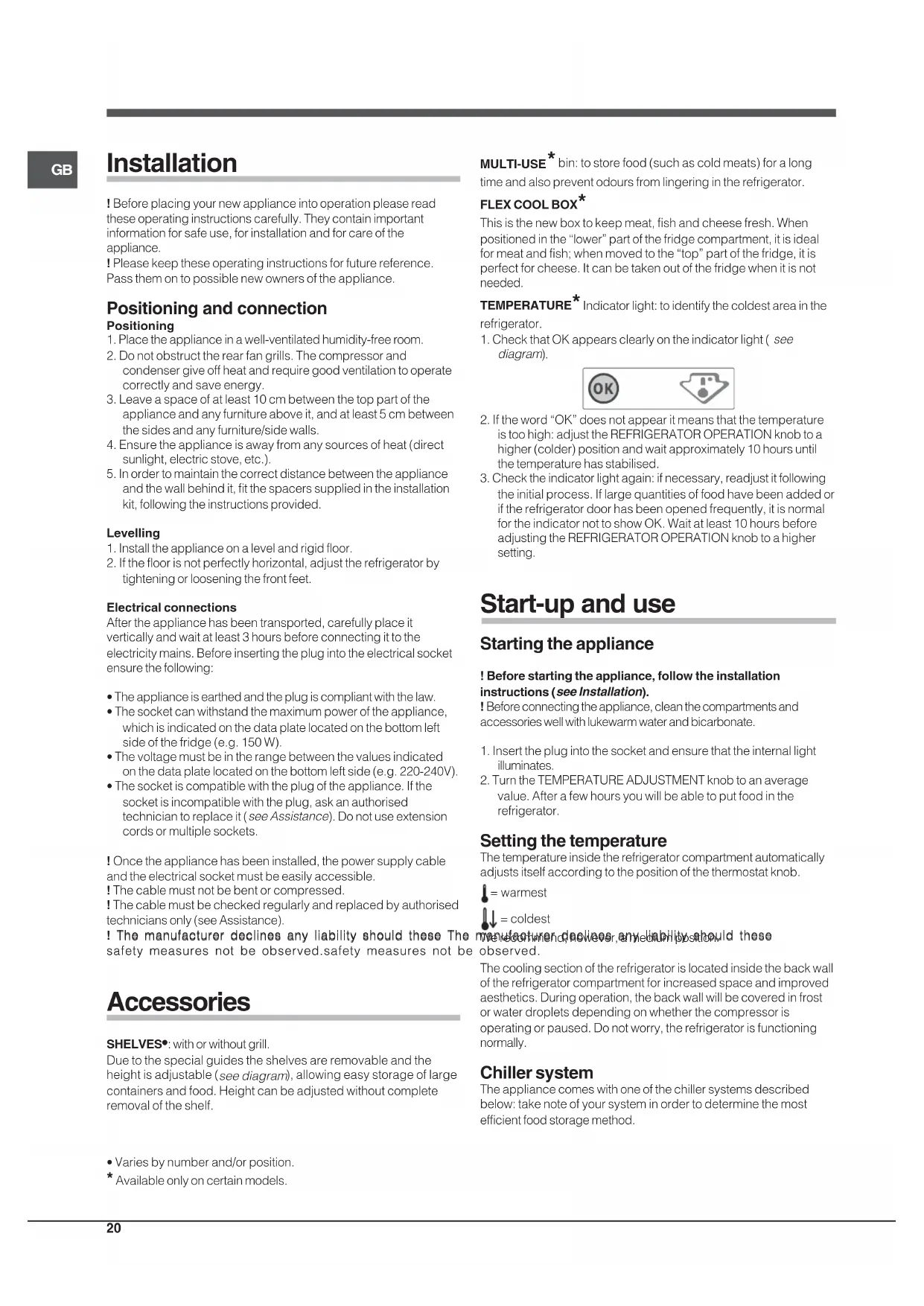 GB Installation ! Before placing your new appliance into operation please readthese operating instructions carefully. They contain importantinformation for safe use, for installation and for care of theappliance.! Please keep these operating instructions for future reference.Pass them on to possible new owners of the appliance. Positioning and connection Positioning1. Place the appliance in a well-ventilated humidity-free room.2. Do not obstruct the rear fan grills. The compressor andcondenser give off heat and require good ventilation to operatecorrectly and save energy.3. Leave a space of at least 10 cm between the top part of theappliance and any furniture above it, and at least 5 cm betweenthe sides and any furniture/side walls.4. Ensure the appliance is away from any sources of heat (directsunlight, electric stove, etc.).5. In order to maintain the correct distance between the applianceand the wall behind it, fit the spacers supplied in the installationkit, following the instructions provided.Levelling1. Install the appliance on a level and rigid floor.2. If the floor is not perfectly horizontal, adjust the refrigerator bytightening or loosening the front feet.Electrical connectionsAfter the appliance has been transported, carefully place itvertically and wait at least 3 hours before connecting it to theelectricity mains. Before inserting the plug into the electrical socketensure the following:• The appliance is earthed and the plug is compliant with the law.• The socket can withstand the maximum power of the appliance,which is indicated on the data plate located on the bottom leftside of the fridge (e.g. 150 W).• The voltage must be in the range between the values indicatedon the data plate located on the bottom left side (e.g. 220-240V).• The socket is compatible with the plug of the appliance. If thesocket is incompatible with the plug, ask an authorisedtechnician to replace it (see Assistance). Do not use extensioncords or multiple sockets.! Once the appliance has been installed, the power supply cableand the electrical socket must be easily accessible.! The cable must not be bent or compressed.! The cable must be checked regularly and replaced by authorisedtechnicians only (see Assistance). ! The manufacturer declines any liability should these The manufacturer declines any liability should these The manufacturer declines any liability should these The manufacturer declines any liability should these The manufacturer declines any liability should thesesafety measures not be observed.safety measures not be observed.safety measures not be observed.safety measures not be observed.safety measures not be observed. Accessories SHELVES•: with or without grill.Due to the special guides the shelves are removable and theheight is adjustable (see diagram), allowing easy storage of largecontainers and food. Height can be adjusted without completeremoval of the shelf.MULTI-USE * bin: to store food (such as cold meats) for a long time and also prevent odours from lingering in the refrigerator.FLEX COOL BOX * This is the new box to keep meat, fish and cheese fresh. Whenpositioned in the “lower” part of the fridge compartment, it is idealfor meat and fish; when moved to the “top” part of the fridge, it isperfect for cheese. It can be taken out of the fridge when it is notneeded.TEMPERATURE * Indicator light: to identify the coldest area in the refrigerator.1. Check that OK appears clearly on the indicator light ( see diagram ). 2. If the word “OK” does not appear it means that the temperatureis too high: adjust the REFRIGERATOR OPERATION knob to ahigher (colder) position and wait approximately 10 hours untilthe temperature has stabilised.3. Check the indicator light again: if necessary, readjust it followingthe initial process. If large quantities of food have been added orif the refrigerator door has been opened frequently, it is normalfor the indicator not to show OK. Wait at least 10 hours beforeadjusting the REFRIGERATOR OPERATION knob to a highersetting. Start-up and use