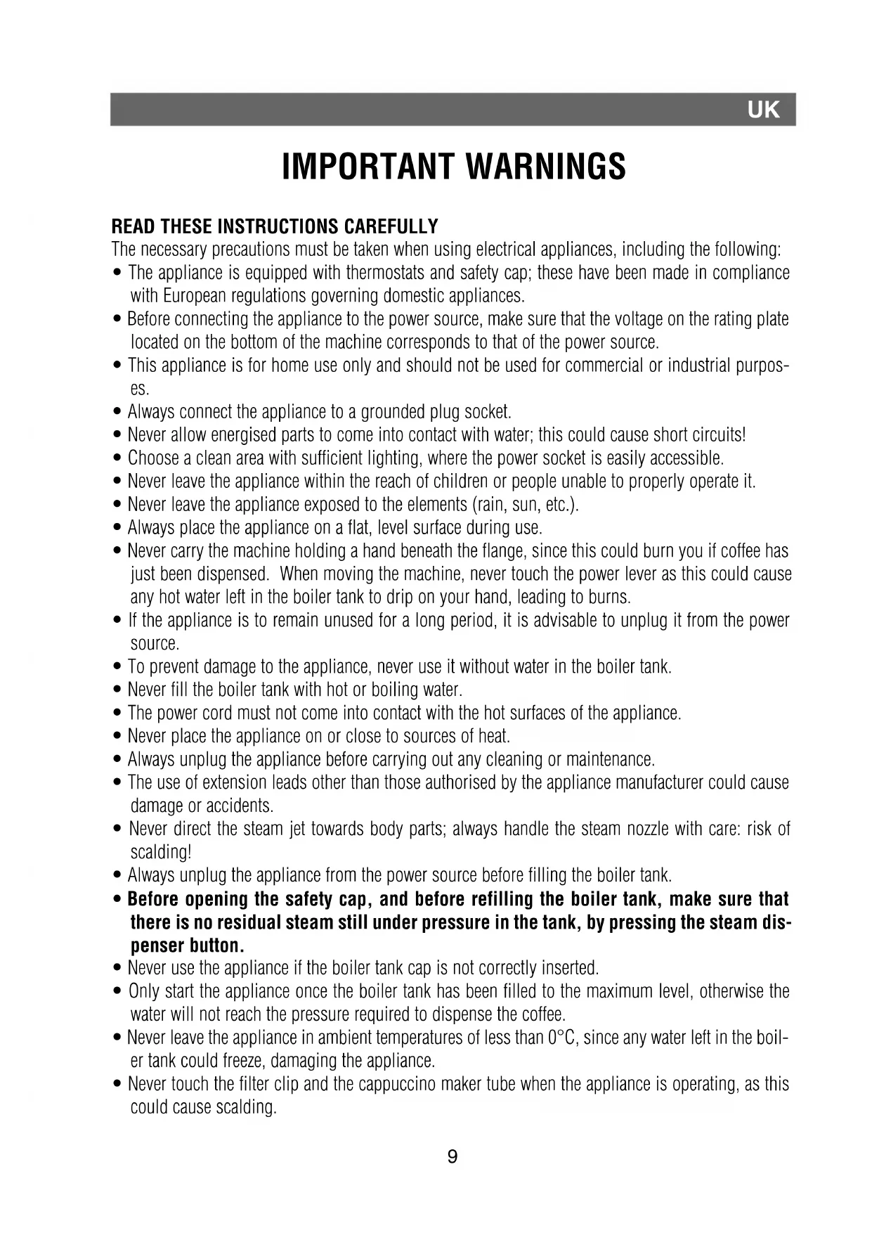 • Never use the appliance if the boiler tank cap is not correctly inserted.