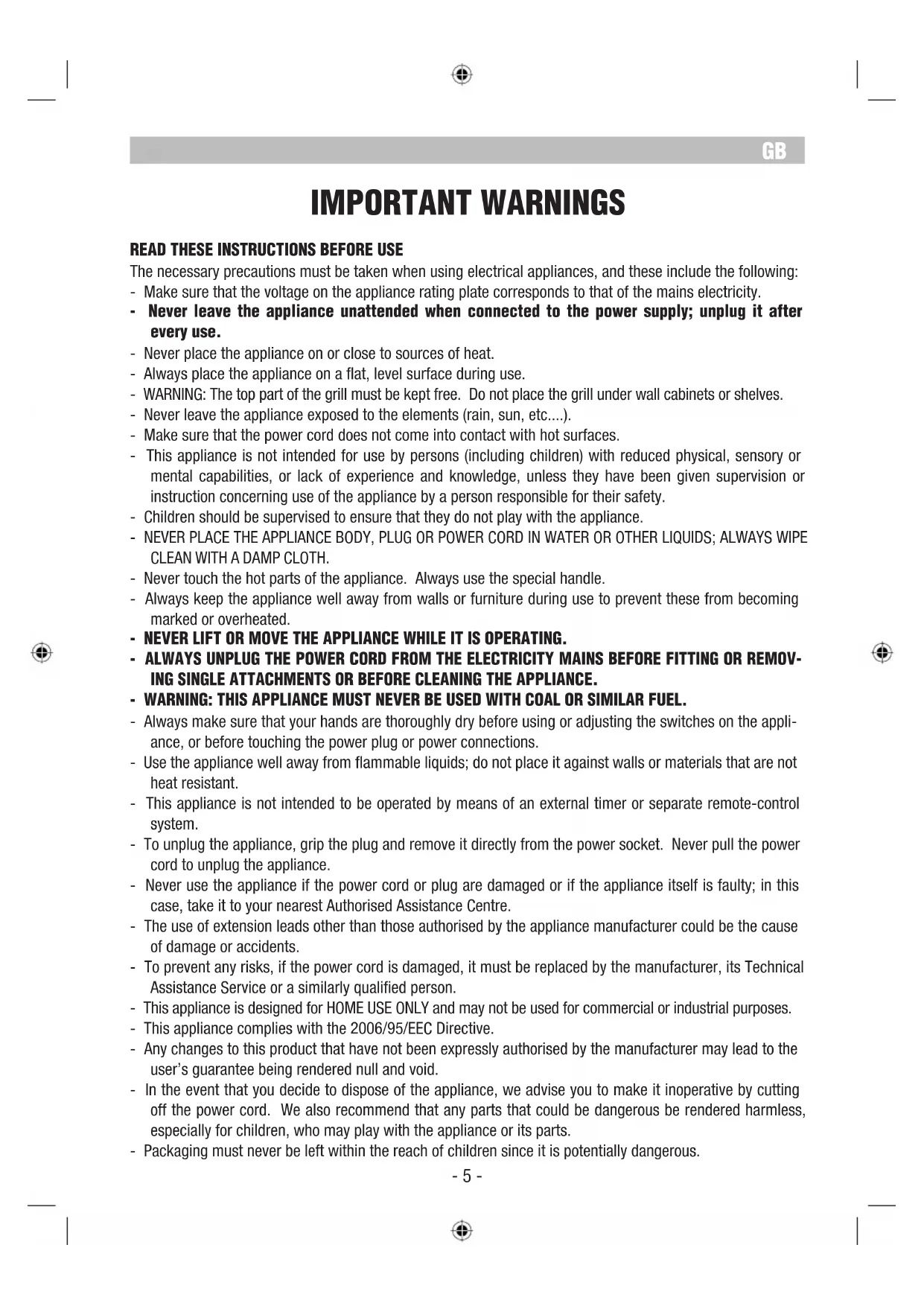 - 4 -IMPORTANT WARNINGS READ THESE INSTRUCTIONS BEFORE USE The necessary precautions must be taken when using electrical appliances, and these include the following: