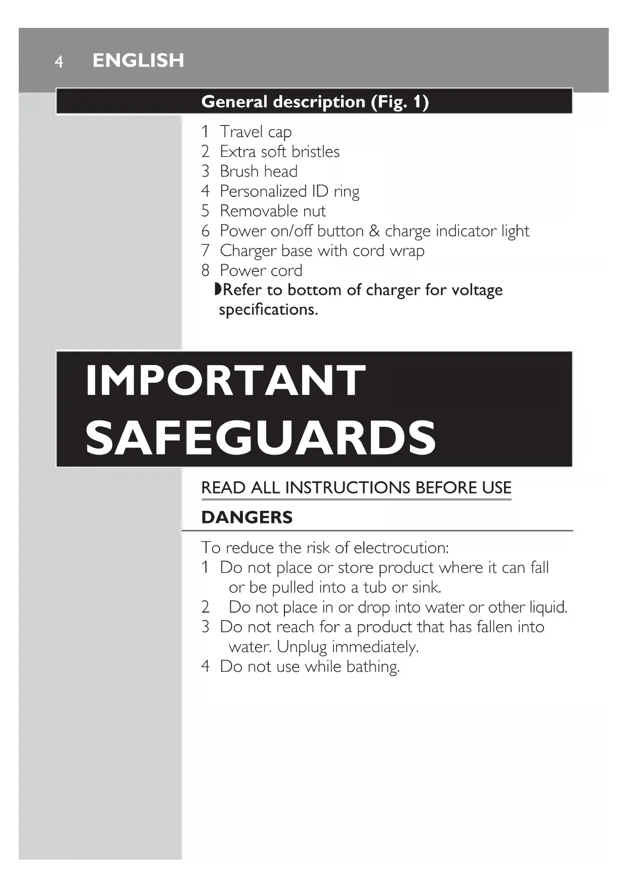 IMPORTANT SAFEGUARDS READ ALL INSTRUCTIONS BEFORE USE DANGERS To reduce the risk of electrocution:
