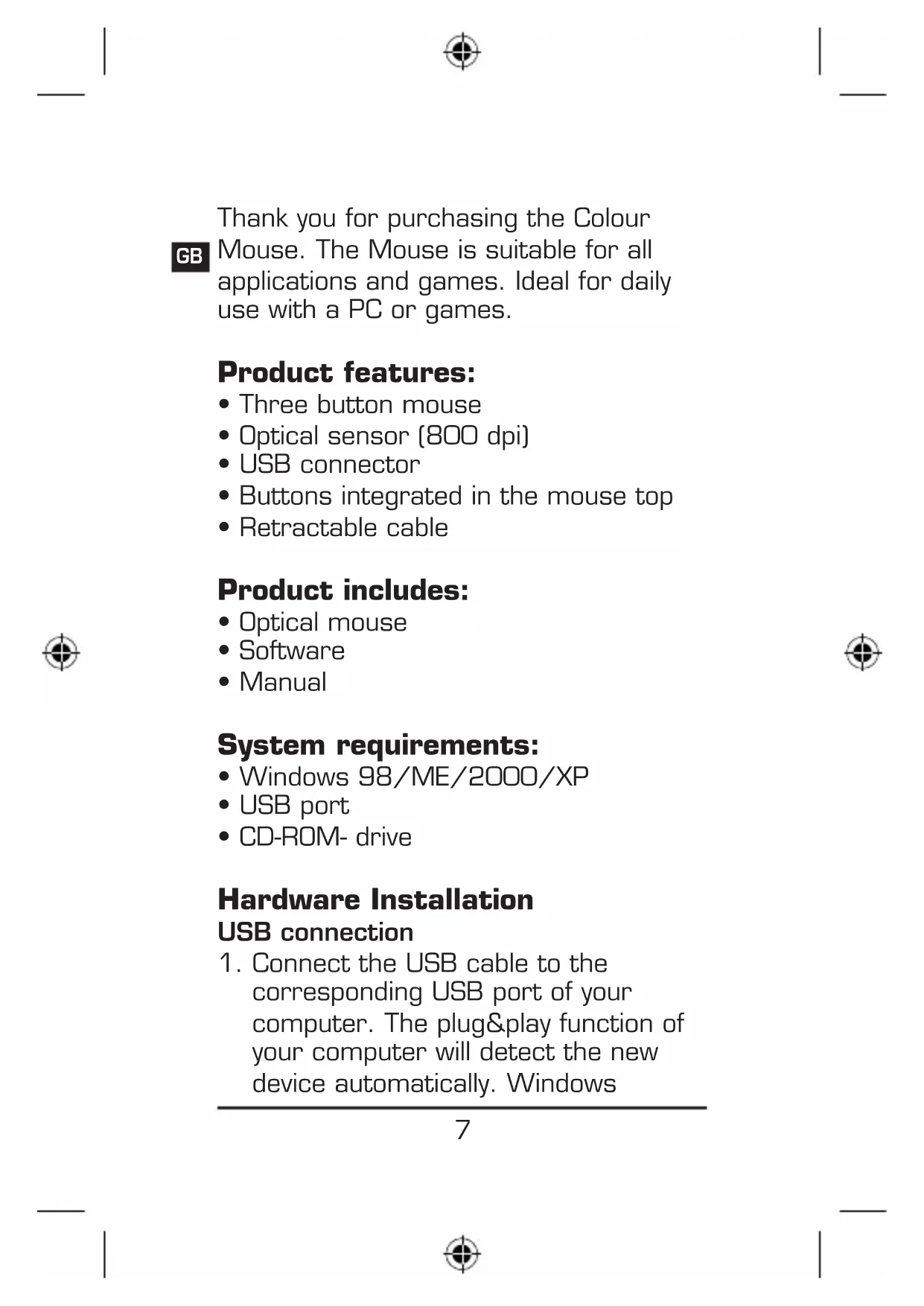 FEI Thank you for purchasing the Colour Mouse. The Mouse is suitable for all applications and games. Ideal for daily use with a PC or games. Product features: