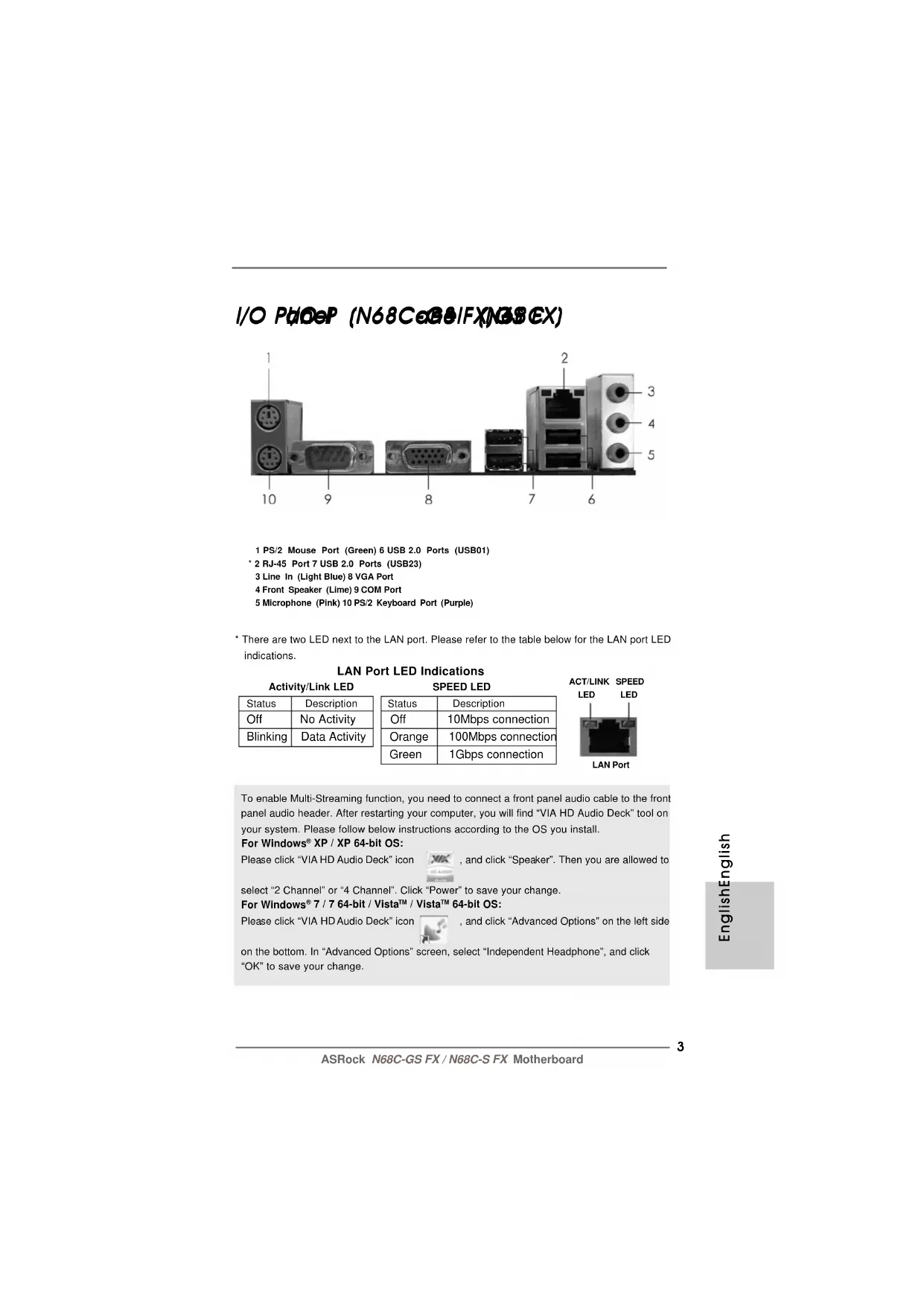 -S FX) 1 PS/2 Mouse Port (Green) 6 USB 2.0 Ports (USB01) * 2 RJ-45 Port 7 USB 2.0 Ports (USB23)3 Line In (Light Blue) 8 VGA Port4 Front Speaker (Lime) 9 COM Port5 Microphone (Pink) 10 PS/2 Keyboard Port (Purple) To enable Multi-Streaming function, you need to connect a front panel audio cable to the front