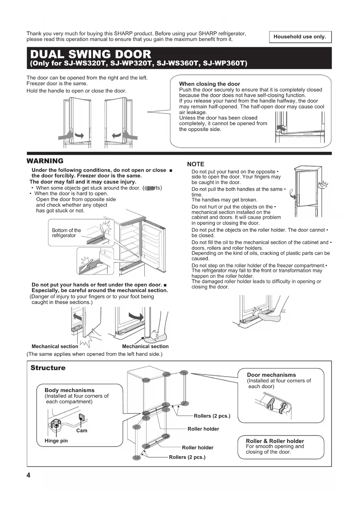 NOTE Do not put your hand on the opposite • side to open the door. Your ngers may be caught in the door.Do not pull the both handles at the same • time. The handles may get broken.Do not hurt or put the objects on the • mechanical section installed on the cabinet and doors. It will cause problem in opening or closing the door.Do not put the objects on the roller holder. The door cannot • be closed.Do not ll the oil to the mechanical section of the cabinet and • doors, rollers and roller holders. Depending on the kind of oils, cracking of plastic parts can be caused.Do not step on the roller holder of the freezer compartment.• The refrigerator may fall to the front or transformation may happen on the roller holder. The damaged roller holder leads to difculty in opening or closing the door. Structure Mechanical section DUAL SWING DOOR