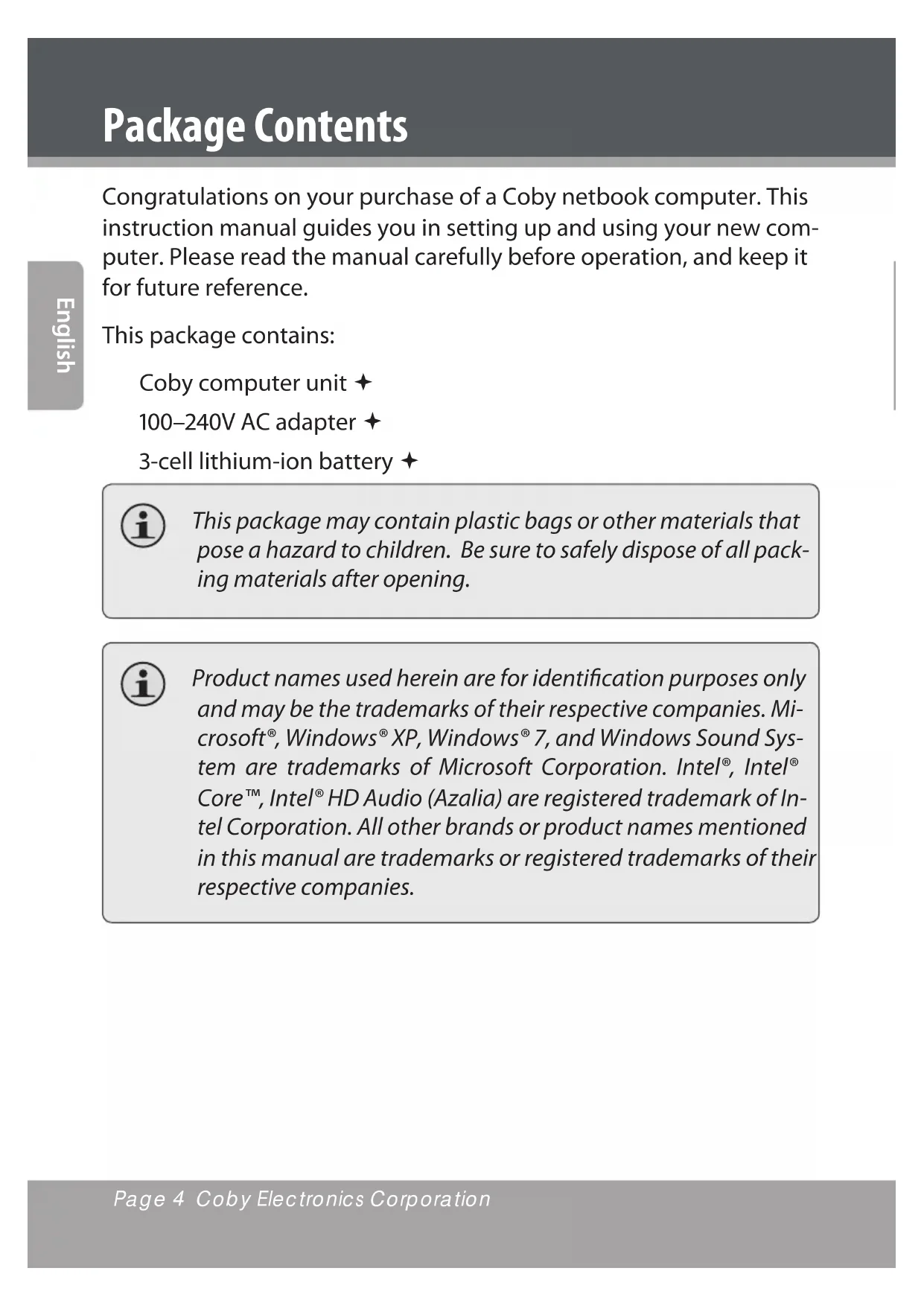 Battery latch (manual)1. Battery pack2. Battery latch (automatic/3. spring-loaded) Vent4. Hard drive compartment5. Do not attempt to disassemble or replace your hard drive. For assistance with hard drive replacement and repair, contact a qualied service professional. To avoid overheating, do not block the vents when the com- puter is in use. Netbook at a GlancePage 12 Coby Electronics Corporation English www.cobyusa.com Page 13 Basic Operation Power Your computer includes both an AC adapter and built-in, rechargeable lithium-ion battery for maximum portability. AC Power Use the AC adapter to run your computer on AC power and charge the battery. To connect the AC adapter: Connect the power cord to the transformer pack. Plug the power cord into an electrical outlet. Connect the AC adapter to the AC power adapter jack of the com- puter. Battery Power Make sure the battery is fully charged before rst use. The battery power status indicator will ash when the battery is low. Connect the AC adapter as instructed above to charge the battery. To replace the battery: Shut down the computer and disconnect all cables, including the AC power cord. Turn the computer over to access the battery release. Slide the bat- tery release latch to the unlock position and hold. Slide the battery out. Slide the replacement battery into the bay until it clicks into place. Slide the release latch to the locked position.Page 12 Coby Electronics Corporation www.cobyusa.com Page 13 English The components and programs on your computer consume power at dierent rates. Using power-intensive components/ programs will cause the battery to drain faster. Your computer’s operating system may run more slowly when operating on battery power. Use only approved battery packs to power your computer. Us- ing an incompatible battery may increase the risk of re or ex- plosion. Do not attempt to disassemble or modify the battery pack. A battery pack other than the one specied by us, or a disassem- bled or modied battery pack, is not covered by the warranty. When disposing of the battery, comply with local ordinances and regulations. Do not attempt to dispose of the battery in your household trash. Basic OperationPage 14 Coby Electronics Corporation English www.cobyusa.com Page 15 Getting Started Open the computer and adjust the display panel for comfortable viewing. Turning On Your Computer Press the power button to turn on the computer. Sleep Mode When you nish working with your computer, you can put it to sleep or shut it down. Use sleep mode if you will be away from your computer for only a short time. To enter sleep mode: Click the Start menu and select Sleep, or Press Fn + Esc. To wake the computer, press the Power button. Wait until the power indicator light starts blinking (indicating that the computer is in sleep) before you move your computer. Moving your computer while the hard disk is spinning may cause damage or loss of data. Shut Down Your computer should be shut down when not in use for 24 hours or more. Enter the Start menu and select Shut Down to turn o the com- puter. Basic OperationPage 14 Coby Electronics Corporation www.cobyusa.com Page 15 English Keyboard Functions Your computer’s standard keyboard incorporates a numeric keypad and function keys. Function Key Combinations The function keys allow you to change your computer’s operating features instantly. See below for more information on using function key combinations. Key Description Fn + Esc Put your computer in sleep mode. Fn + F1 Enable/disable the built-in wireless internet. Fn + F3 Mute. Fn + F4 Enable/disable the touch pad. Fn + F5 Shift to other connected display devices, i.e. another monitor. Fn + F6 Decrease display brightness. Fn + F7 Increase display brightness. Fn + F8 Decrease computer volume. Fn + F9 Increase computer volume. Fn + F10 Turn on/o the LCD screen. Fn + Ins/NumLk Enable/disable the Numeric keypad. Basic OperationPage 16 Coby Electronics Corporation English www.cobyusa.com Page 17 Basic Operation Numeric Keypad When enabled, the keys indicated below can be used as a 10-key nu- meric keypad. To enable or disable the numeric keypad, press Fn+Ins/ NumLk.Page 16 Coby Electronics Corporation www.cobyusa.com Page 17 English Basic Operation Using the Touchpad Use the touchpad and integrated mouse to navigate your computer’s operating system. To move the cursor on the screen, slide your ngertip over the touchpad in the direction in which you want the cursor to move. Use the left/right click buttons on the integrated mouse just as you would the left/right click on a conventional mouse to select objects, open programs, or retrieve information. Touchpad1. Left click2. Right click3. Use one nger only to navigate the touchpad. Moisture or dirt may cause the touchpad to function incorrectly. Sharp objects or excessive pressure may damage the touch- pad’s surface. Do not attempt to remove the cover of the touchpad.Page 18 Coby Electronics Corporation English www.cobyusa.com Page 19 Features Using Memory Cards Your computer includes an SD memory card slot for easy transfer of data. To insert a memory card, orient the memory card with the label upward. Gently slide the card into the slot. To remove a memory card, grasp it by the end and pull gently. When a memory card is fully inserted, the rear half of the card will remain outside of the card slot. Using the Web Camera The built-in web camera can be used for capturing photos, recording video, or as a component of chat and conferencing applications. Windows users will need to install a third-party dedicated applica- tion in order to take pictures and video using the webcam. Using the Internet Your computer comes with LAN port for Ethernet connection or local area network (LAN), as well as a built-in wireless connection. LAN Port The LAN port supports a standard RJ-45 connector, and allows you to con- nect the computer to an Ethernet connection and local area network (LAN). Do not attempt to conn