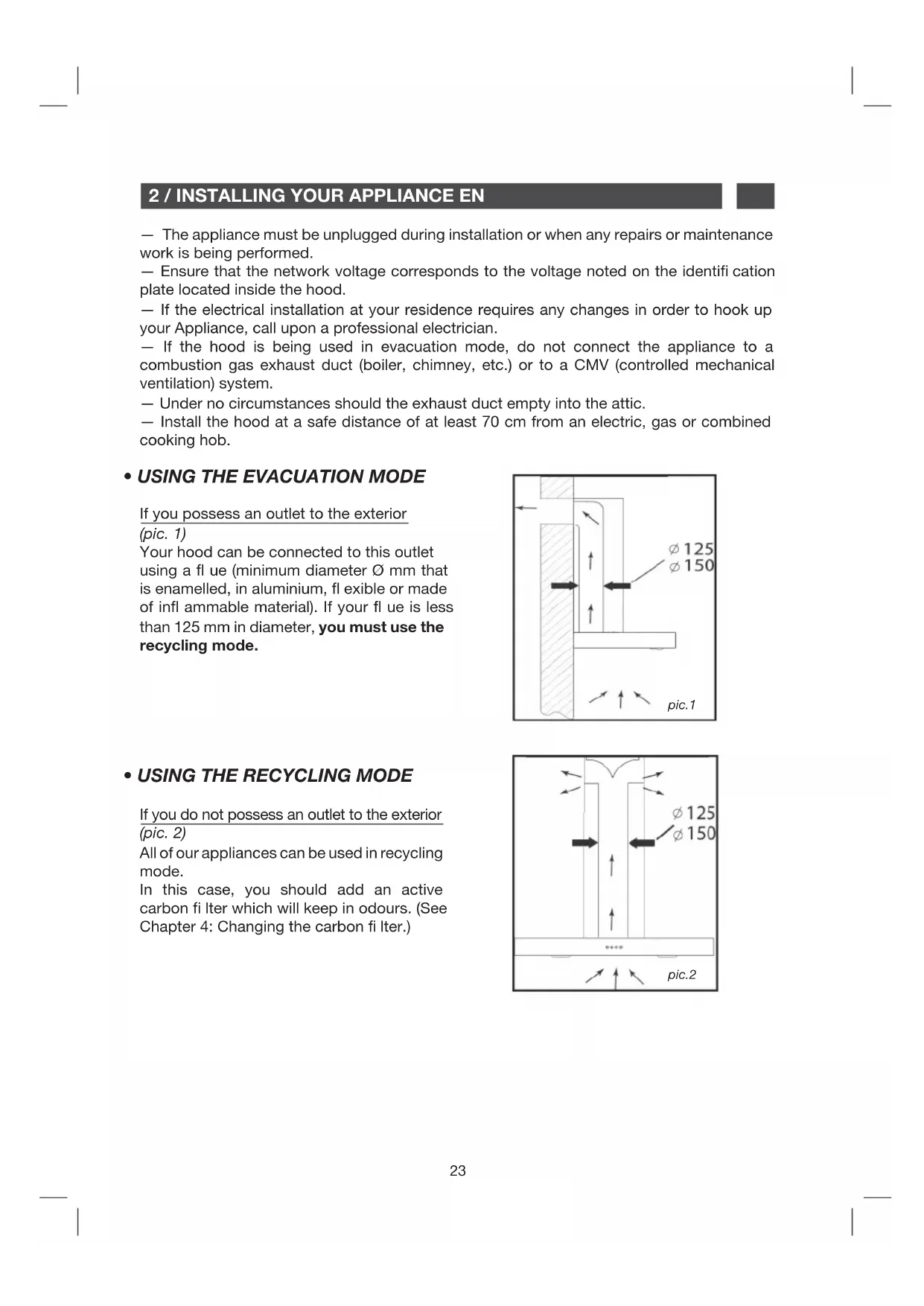 ample) the “recycling” version of the hood should be installed. Do not use the hood without