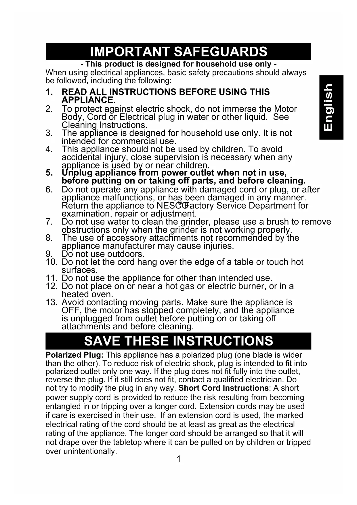 APPLIANCE. To protect against electric shock, do not immerse the Motor Body, Cord or Electrical plug in water or other liquid. See Cleaning Instructions. The appliance is designed for household use only. It is not intended for commercial use. This appliance should not be used by children. To avoid accidental injury, close supervision is necessary when any appliance is used by or near children. Unplug appliance from power outlet when not in use, before putting on or taking off parts, and before cleaning. Do not operate any appliance with damaged cord or plug, or after appliance malfunctions, or has been damaged in any manner. Return the appliance to NESCO