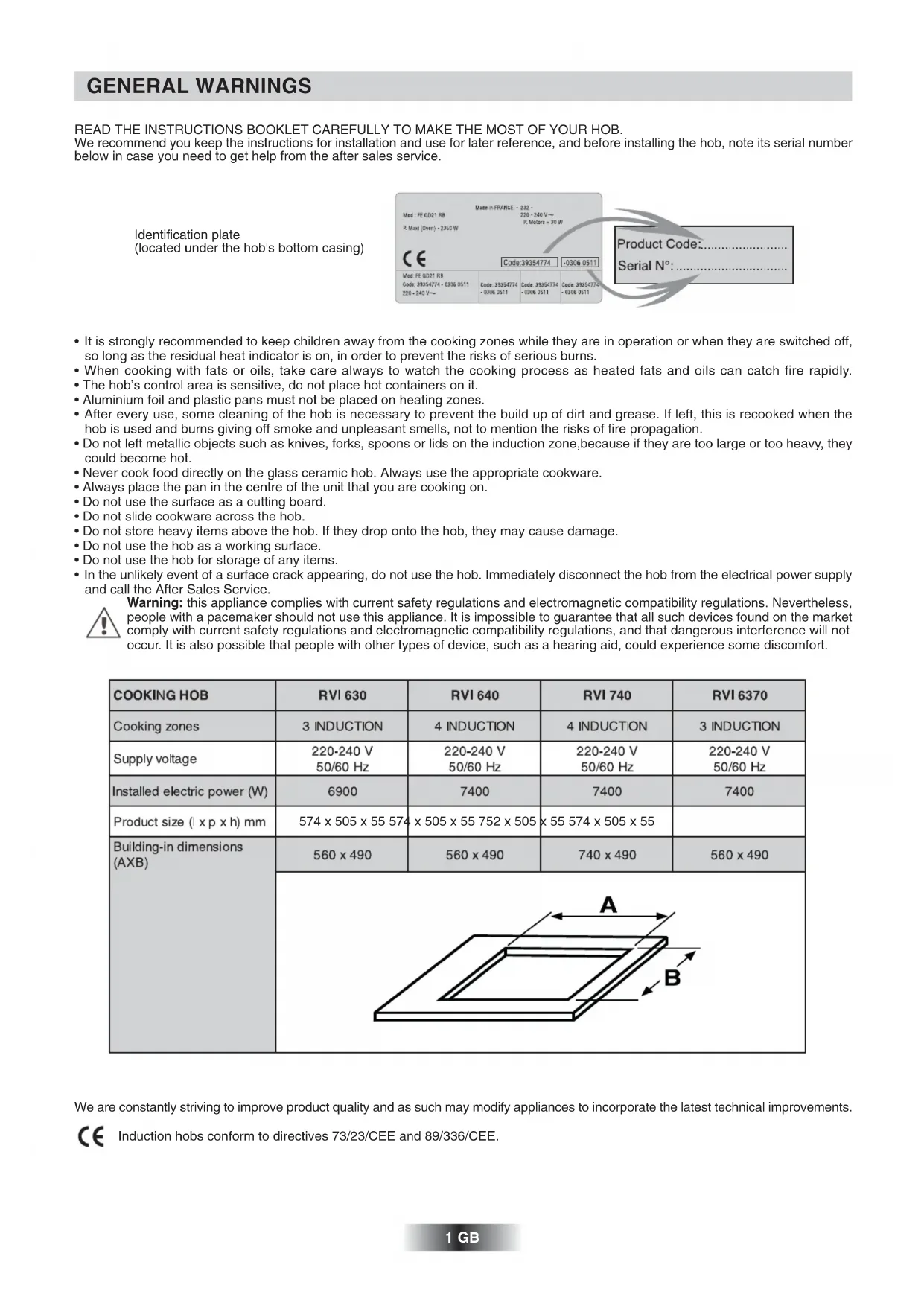 FR NOTICE D'EMPLOI ET D'INSTALLATION TABLE À INDUCTION INSTRUCTIONS FOR USE AND INSTALLATION INDUCTION HOBS GB1 GB READ THE INSTRUCTIONS BOOKLET CAREFULLY TO MAKE THE MOST OF YOUR HOB.