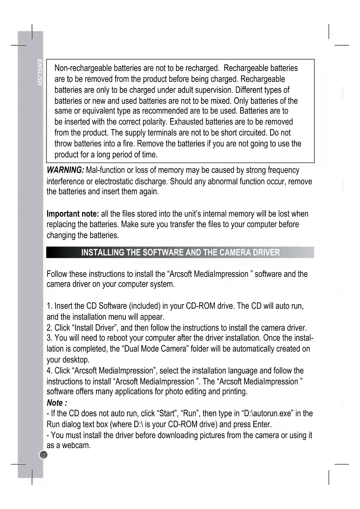 INSTALLING THE SOFTWARE AND THE CAMERA DRIVER Follow these instructions to install the “Arcsoft MediaImpression ” software and the