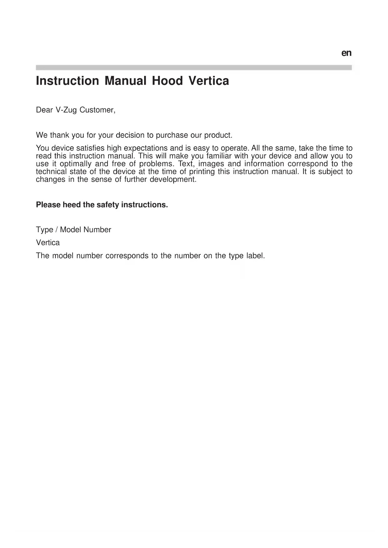 coperchio di vetro facendo uso di un piccolo giravite. Estrarre il mezzo d’illuminazione e sostituirlo con uno nuovo evitando il contatto diretto tra la lampadina e le dita. Le illuminazioni guaste vanno sostituite immediatamente con illuminazioni nuove. Disfunzioni Siete pregati di rivolgervi immediatamente al nostro servizio d’assistenza clienti se: - la cappa d’aspirazione vapore causa rumori indefinibili e non siete in grado di constatare alcun difetto dopo aver controllato la tubazione dell’aria di scarico; - constatate, ad esempio udendo rumori strani, che il motore funziona irregolarmente o è guasto; - la commutazione non funziona regolarmente. Siete pregati di indicare assolutamente la designazione tipo della vostra cappa d’aspirazione vapore nonché il relativo numero di serie. Trovate queste indicazioni sulla targhetta situata nella zona filtri all’interno della cappa. itSmaltimento Imballaggio L’imballaggio dell’apparecchio è riciclabile. Come materiale d’imballaggio vengono utilizzati cartone e foglia di polietilene (PE). Questi materiali vanno smaltiti in modo ecologico in osservanza delle rispettive prescrizioni vigenti localmente. Cappa d’aspirazione vapore Il vostro comune vi consiglia per quanto concerne l’eliminazione ecologica degli elettrodomestici vecchi. Avvertenze relative all’ambiente Tutti i modelli della V-Zug sono contrassegnati in ottemperanza alla direttiva europea 2002/96/CEE relativa agli apparecchi elettrici ed elettronici (waste electrical and electronical equipment - WEEE). Questa direttiva definisce le condizioni di base per la ripresa in consegna e lo sfruttamento di apparecchi vecchi sull’intero territorio UE. Siete pregati di informarvi presso il vostro concessionario relativamente alle vie di smaltimento attuali. Dati tecnici Collegamento alla rete: 220-240V / 50-60Hz, 600W option 300W Mezzo d’illuminazione: alogeno 12V, 20W Tipo Sockel G/4 21520 itInstruction Manual Hood Vertica Dear V-Zug Customer, We thank you for your decision to purchase our product. You device satisfies high expectations and is easy to operate. All the same, take the time to read this instruction manual. This will make you familiar with your device and allow you to use it optimally and free of problems. Text, images and information correspond to the technical state of the device at the time of printing this instruction manual. It is subject to changes in the sense of further development. Please heed the safety instructions. Type / Model Number Vertica The model number corresponds to the number on the type label. enSafety Instructions This instruction manual contains important information that must be taken into account so that the exhaust hood and be installed and operated safely and without danger. Carefully store the instruction manual and installation instructions for later reference. Intended Use The exhaust hood may only be used to remove cooking vapors above cooking devices in private households. Any other use is deemed as other than intended. Improper use of the hood can cause harm to persons and objects. The exhaust hood may not be used to store objects such as bottles or spice containers or other loose objects. Installation This device may only be installed by authorized service personnel in compliance with all relevant regulations of the companies providing electricity as well as the building regulations of the respective countries. Please note the installation instructions during installation! Damaged devices may not be operated. Defective parts must be replaced by original parts. Repairs may only be conducted by authorized service technicians. Risk of Poisoning! During simultaneous operation of an exhaust hood for exhaust purposes and other heat producing appliances dependent upon the air in the room (e.g. wood, gas, oil or coal fueled devices) in one room, deadly flammable gases could be fed back into the room through negative pressure. Therefore, the operator must provide sufficient fresh air at all times. The negative pressure in the room may not be greater than 4 Pa (0.04 mbar). The exhaust may never be operated without a grease filter and must always be supervised while operated. Risk of Fire! Filters filled with too much grease carry a risk of fire. Only fry under an exhaust hood if there is constant supervision! Be certain to clean the filter regularly! Cooking flambé style under the hood is not allowed! Gas devices may only be used under the exhaust hood with pots on them! If you are using more than 3 gas operated cooking devices at the same time, please run the exhaust hood at power level 2 or higher. This will prevent heat accumulation in the device. Risk of Electrical Shock! Please do not clean the hood with a steam cleaning device or a high pressure cleaner. The hood must be separated from the po- wer supply during cleaning. Subject to technical changes! CAUTION: Accessible parts may become hot when used with cooking appliances. General Functionality: The exhaust hood has been specially developed for the exhaust of cooking vapors in private households. The rising cooking vapors are caught by the exhaust hood and removed via a grease filter through exhaust slits (with an additional active carbon filter in the case of air recirculation). For optical reasons, the front side of the exhaust hood is equipped with a special glass pane as well as titanium panels. The glass pane with a central recess is arranged on the wedge shaped hood body in such a manner that the titanium panels are flush with the glass recess. The titanium panels are arranged at intervals with each other, so that an exhaust vent is created. The grease filter is covered by the titanium panels. Access to the grease filter is provided by removing the titanium panels. Illumination is installed on the underside of the hood. The hood body is made out of stainless steel or painted sheet metal in conjunction with glass and titanium for hygienic reasons. The exhaust po