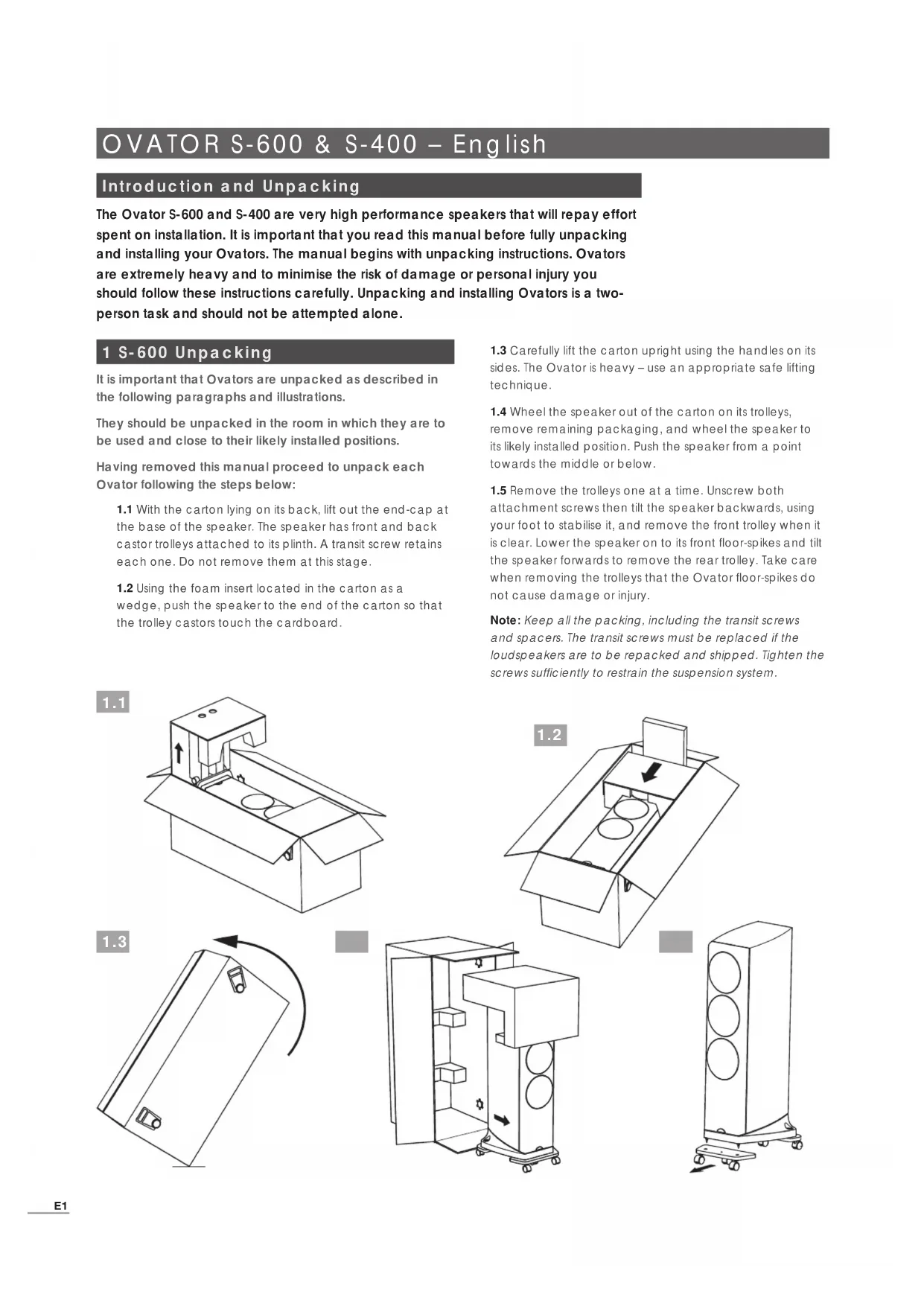 REFERENCE MANUAL OVATOR S-600 and S-400 LOUDSPEAKERS ENGLISH, DEUTSCH, FRANÇAIS, ITALIANO, ESPAñOL, NEDERLANDS, 中文E1 OVATOR S-600 & S-400 – English Introduction and Unpacking The Ovator S-600 and S-400 are very high performance speakers that will repay effort spent on installation. It is important that you read this manual before fully unpacking and installing your Ovators. The manual begins with unpacking instructions. Ovators are extremely heavy and to minimise the risk of damage or personal injury you should follow these instructions carefully. Unpacking and installing Ovators is a two- person task and should not be attempted alone. 1 S-600 Unpacking It is important that Ovators are unpacked as described in the following paragraphs and illustrations. They should be unpacked in the room in which they are to be used and close to their likely installed positions. Having removed this manual proceed to unpack each Ovator following the steps below: 1.1 With the carton lying on its back, lift out the end-cap at the base of the speaker. The speaker has front and back castor trolleys attached to its plinth. A transit screw retains each one. Do not remove them at this stage.1.2 Using the foam insert located in the carton as a wedge, push the speaker to the end of the carton so that the trolley castors touch the cardboard.1.3 Carefully lift the carton upright using the handles on its sides. The Ovator is heavy – use an appropriate safe lifting technique.1.4 Wheel the speaker out of the carton on its trolleys, remove remaining packaging, and wheel the speaker to its likely installed position. Push the speaker from a point towards the middle or below.1.5 Remove the trolleys one at a time. Unscrew both attachment screws then tilt the speaker backwards, using your foot to stabilise it, and remove the front trolley when it is clear. Lower the speaker on to its front floor-spikes and tilt the speaker forwards to remove the rear trolley. Take care when removing the trolleys that the Ovator floor-spikes do not cause damage or injury.Note: Keep all the packing, including the transit screws and spacers. The transit screws must be replaced if the loudspeakers are to be repacked and shipped. Tighten the screws sufficiently to restrain the suspension system.