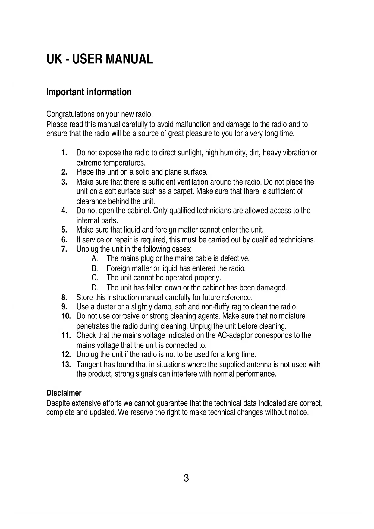 Important information Congratulations on your new radio. Please read this manual carefully to avoid malfunction and damage to the radio and to ensure that the radio will be a source of great pleasure to you for a very long time.