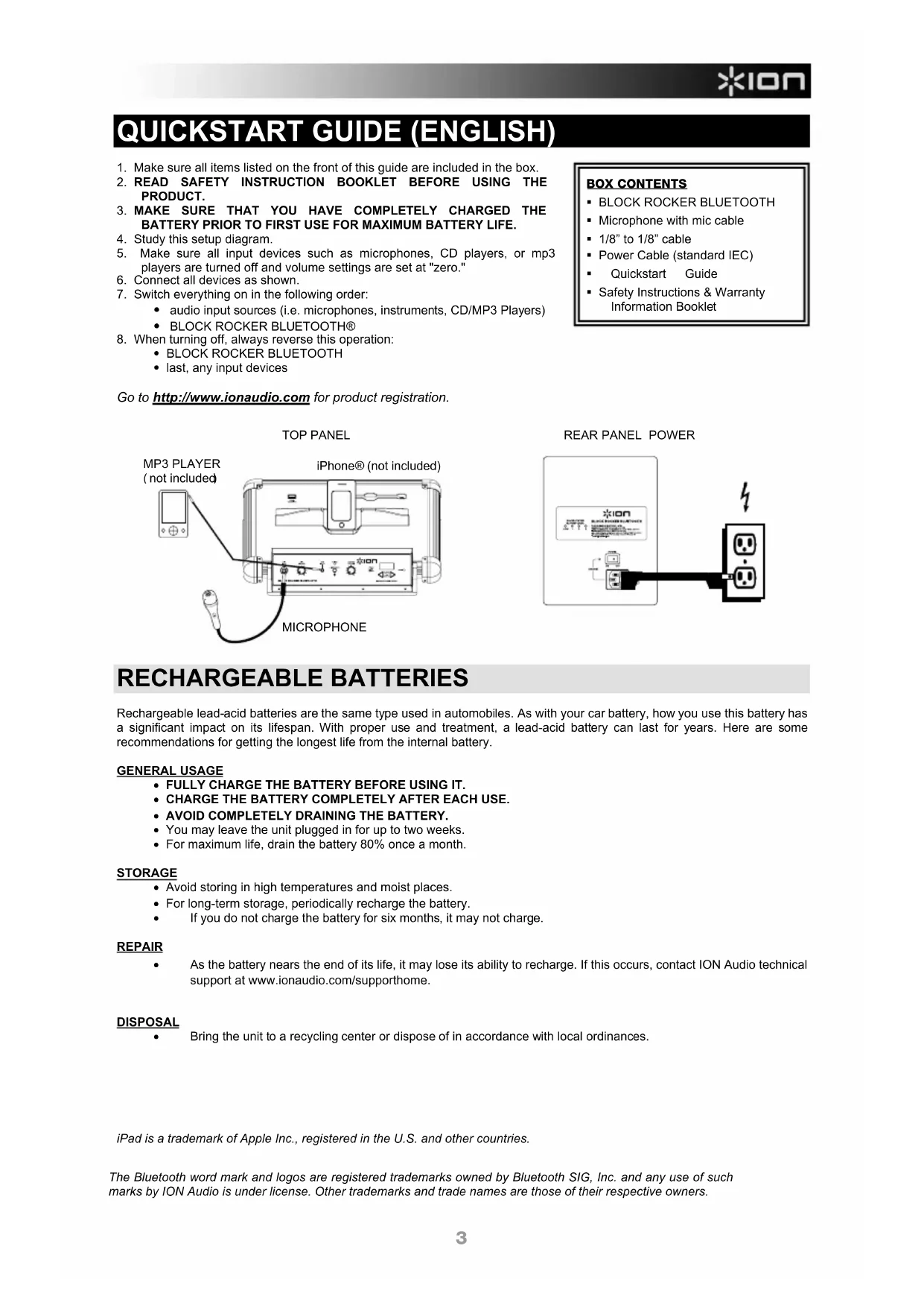 REAR PANEL POWER TOP PANEL MICROPHONEiPhone® (not included) iPad is a trademark of Apple Inc., registered in the U.S. and other countries. The Bluetooth word mark and logos are registered trademarks owned by Bluetooth SIG, Inc. and any use of suchmarks by ION Audio is under license. Other trademarks and trade names are those of their respective owners. MP3 PLAYER