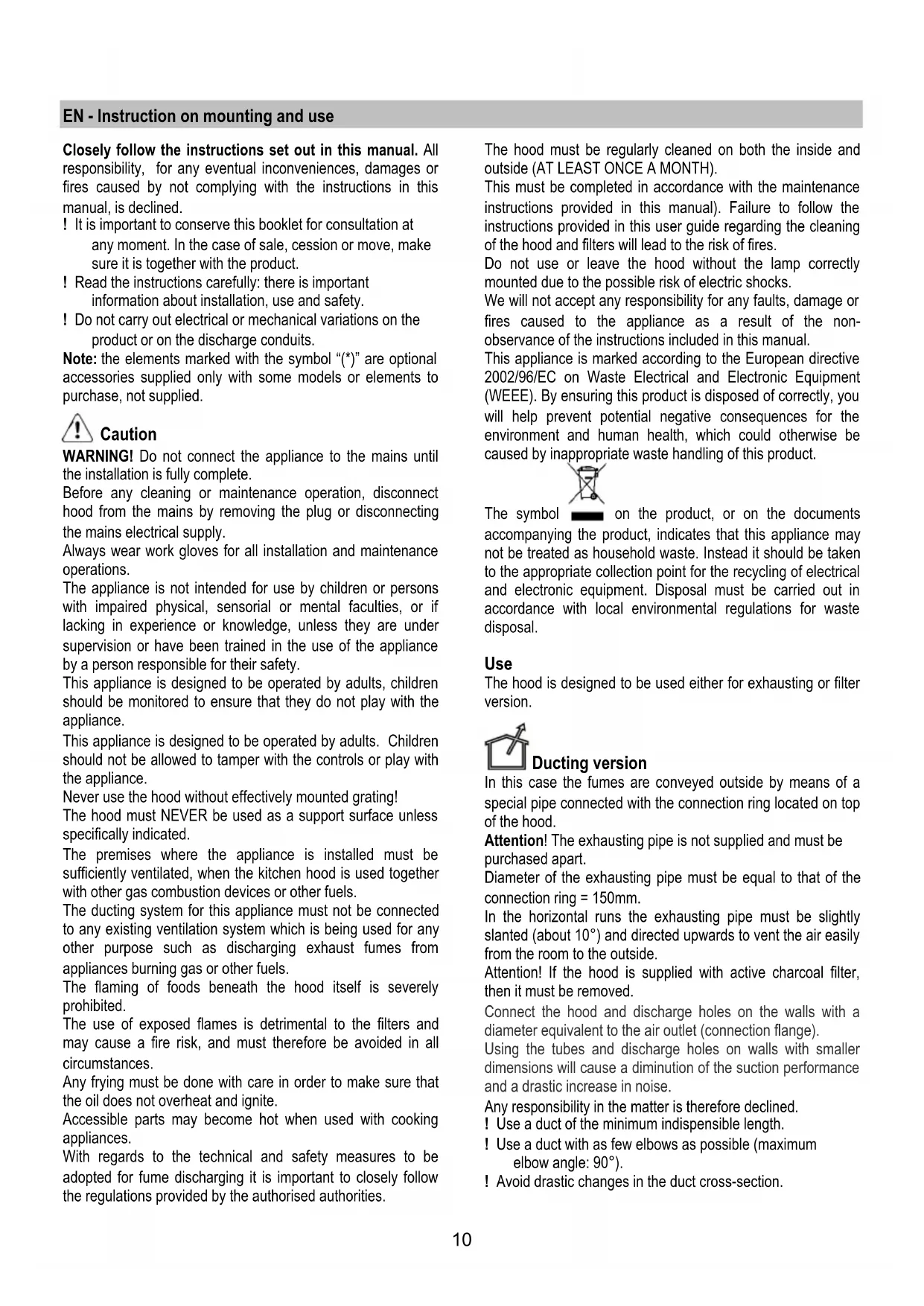 vapours. It is recommended that the cooker hood suction is