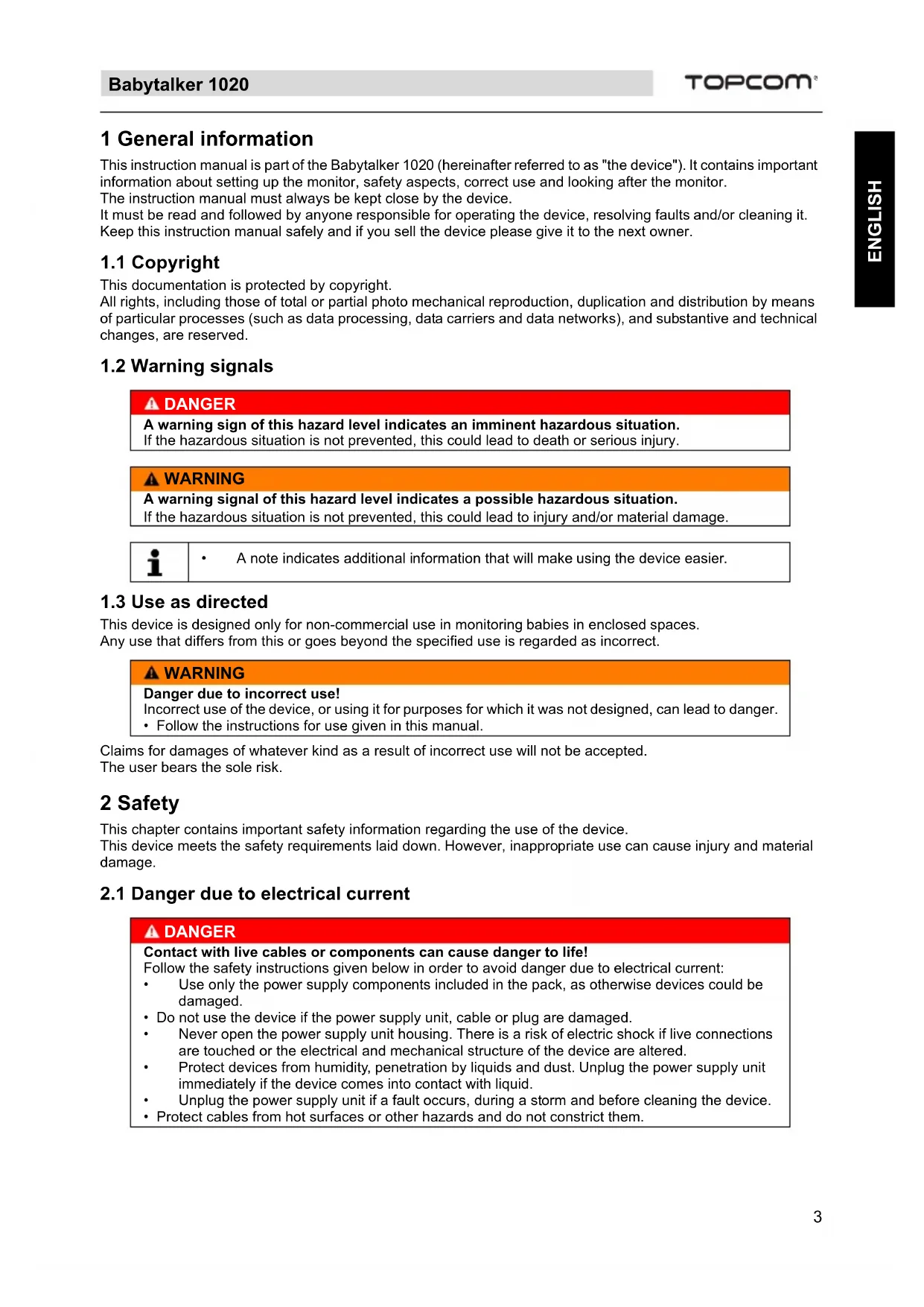 ENGLISH 1 General information This instruction manual is part of the Babytalker 1020 (hereinafter referred to as "the device"). It contains important information about setting up the monitor, safety aspects, correct use and looking after the monitor. The instruction manual must always be kept close by the device. It must be read and followed by anyone responsible for operating the device, resolving faults and/or cleaning it. Keep this instruction manual safely and if you sell the device please give it to the next owner.