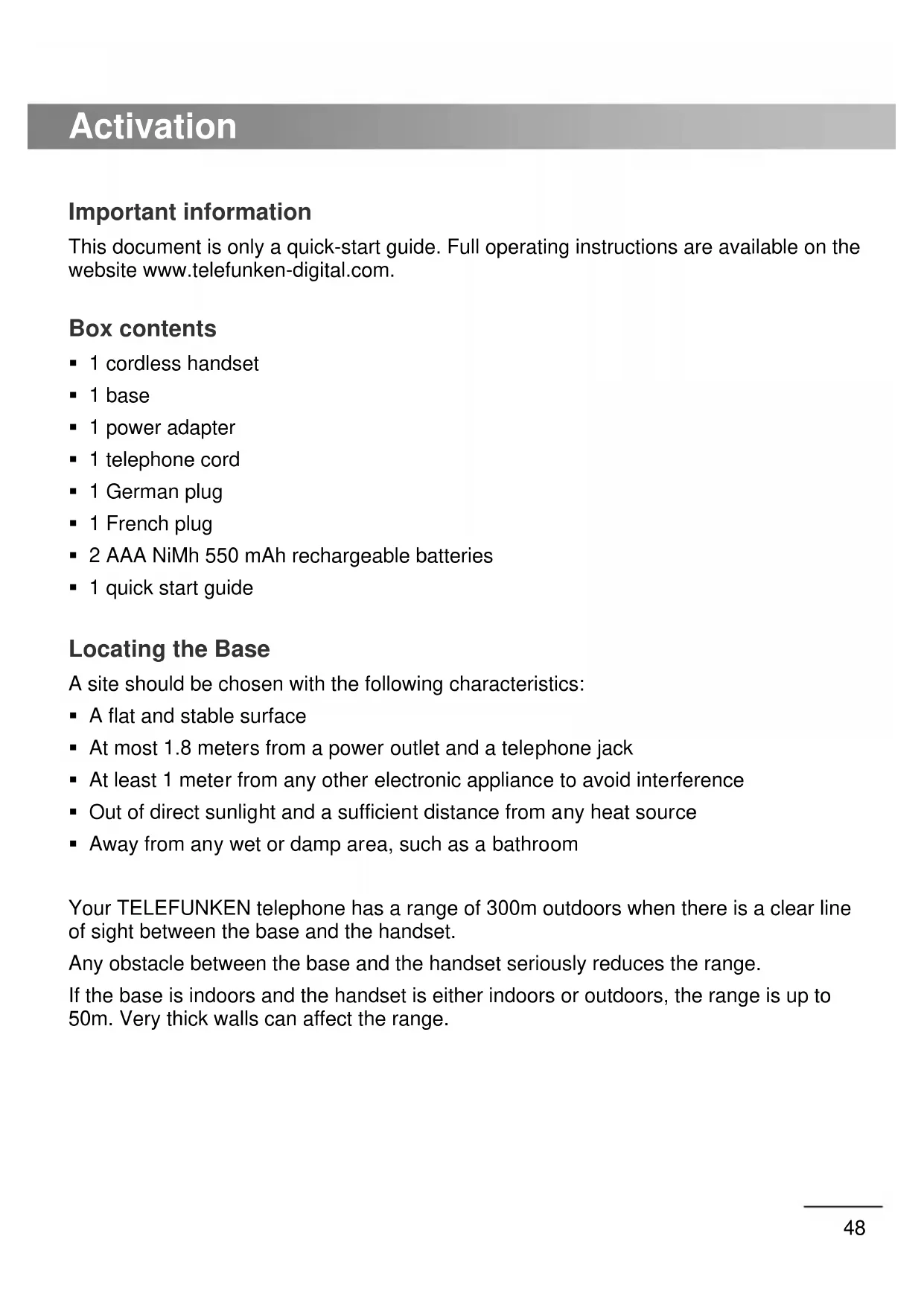 Activation Important information This document is only a quick-start guide. Full operating instructions are available on the website www.telefunken-digital.com. Box contents 1 cordless handset 1 base 1 power adapter 1 telephone cord 1 German plug 1 French plug 2 AAA NiMh 550 mAh rechargeable batteries 1 quick start guide Locating the Base A site should be chosen with the following characteristics: A flat and stable surface At most 1.8 meters from a power outlet and a telephone jack At least 1 meter from any other electronic appliance to avoid interference Out of direct sunlight and a sufficient distance from any heat source Away from any wet or damp area, such as a bathroom Your TELEFUNKEN telephone has a range of 300m outdoors when there is a clear line of sight between the base and the handset. Any obstacle between the base and the handset seriously reduces the range. If the base is indoors and the handset is either indoors or outdoors, the range is up to 50m. Very thick walls can affect the range.49