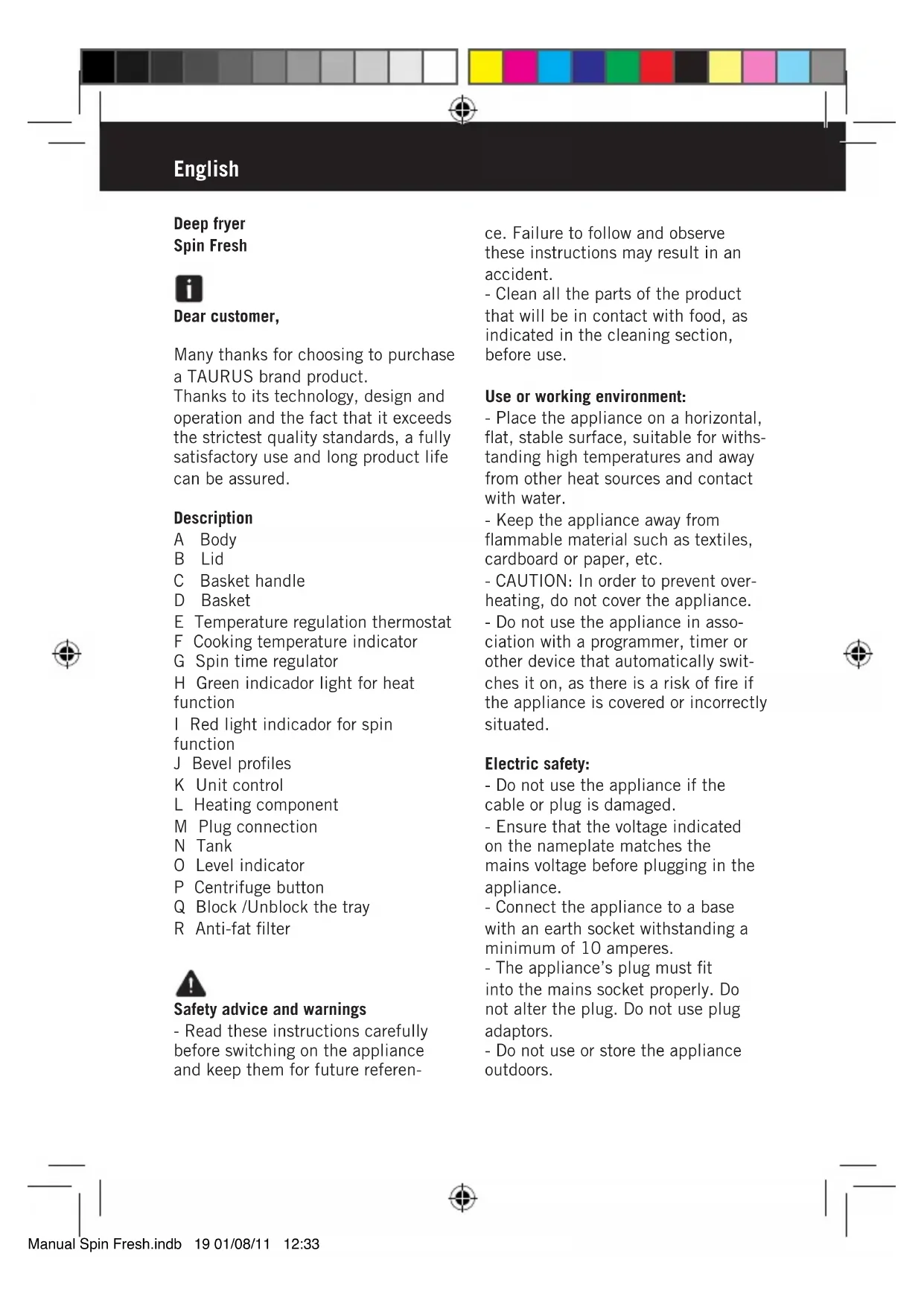 Download the instructions for your Deep fryer in PDF format for free! Find your manual Spin Fresh - TAURUS and take your electronic device back in hand. On this page are published all the documents necessary for the use of your device. Spin Fresh by TAURUS.