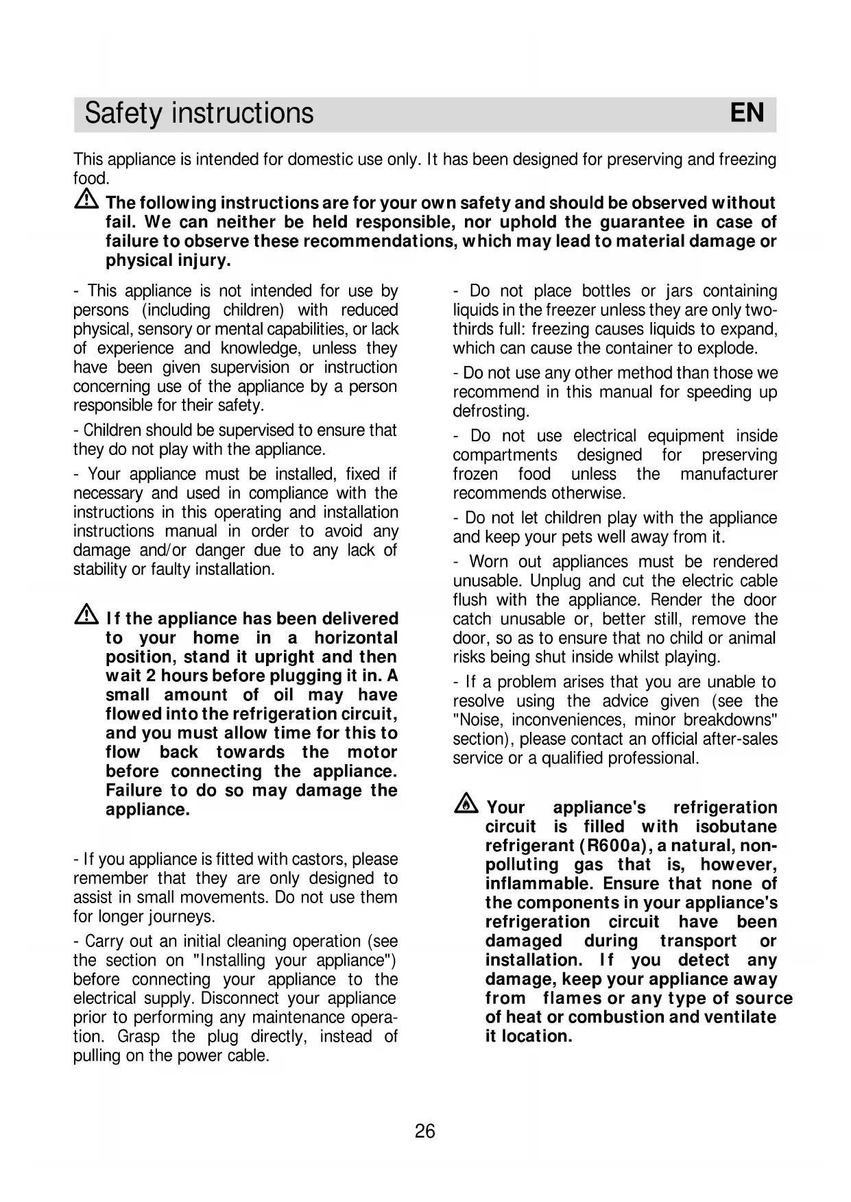This appliance is intended for domestic use only. It has been designed for preserving and freezing