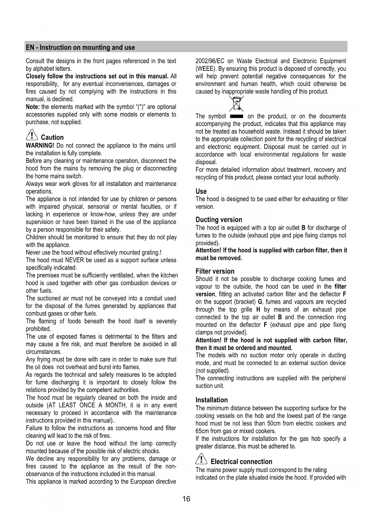 Failure to follow the instructions as concerns hood and filter