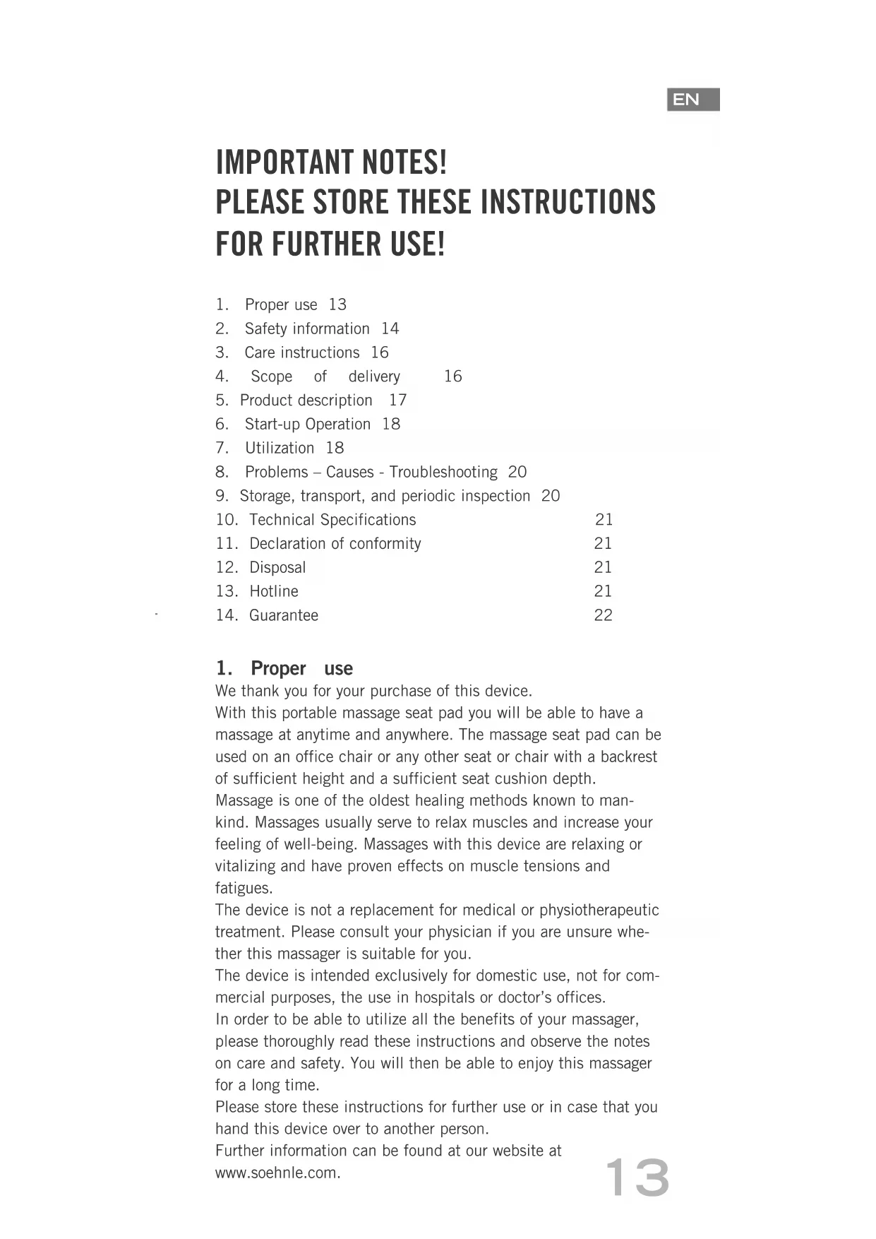We thank you for your purchase of this device. With this portable massage seat pad you will be able to have a massage at anytime and anywhere. The massage seat pad can be used on an office chair or any other seat or chair with a backrest of sufficient height and a sufficient seat cushion depth. Massage is one of the oldest healing methods known to man- kind. Massages usually serve to relax muscles and increase your feeling of well-being. Massages with this device are relaxing or vitalizing and have proven effects on muscle tensions and fatigues. The device is not a replacement for medical or physiotherapeutic treatment. Please consult your physician if you are unsure whe- ther this massager is suitable for you. The device is intended exclusively for domestic use, not for com- mercial purposes, the use in hospitals or doctor’s offices. In order to be able to utilize all the benefits of your massager, please thoroughly read these instructions and observe the notes on care and safety. You will then be able to enjoy this massager for a long time. Please store these instructions for further use or in case that you hand this device over to another person. Further information can be found at our website at www.soehnle.com.