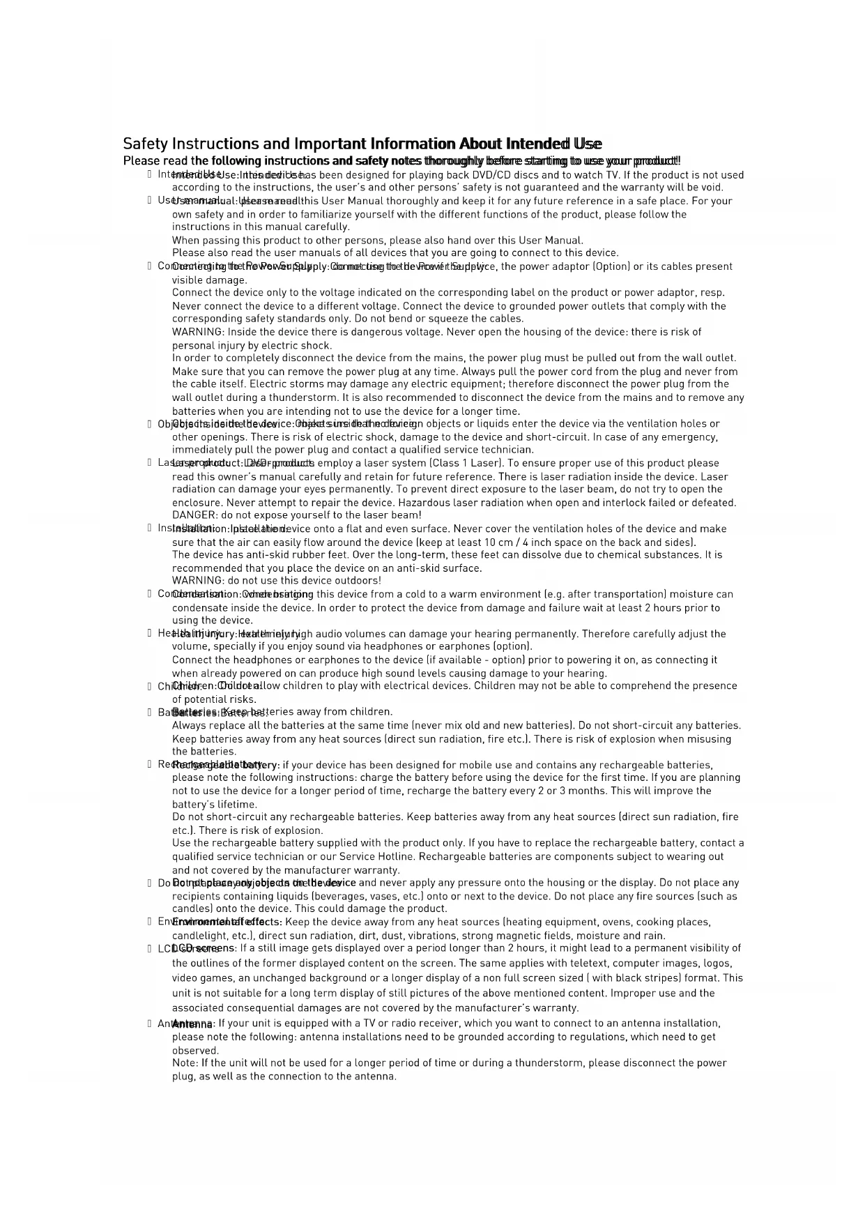 Please read the following instructions and safety notes thoroughly before starting to use your product! Please read the following instructions and safety notes thoroughly before starting to use your product!Please read the following instructions and safety notes thoroughly before starting to use your product! Please read the following instructions and safety notes thoroughly before starting to use your product! Intended Use: Intended Use:Intended Use: Intended Use: this device has been designed for playing back DVD/CD discs and to watch TV. If the product is not used according to the instructions, the user’s and other persons’ safety is not guaranteed and the warranty will be void. User manual: User manual:User manual: User manual: please read this User Manual thoroughly and keep it for any future reference in a safe place. For your own safety and in order to familiarize yourself with the different functions of the product, please follow the instructions in this manual carefully. When passing this product to other persons, please also hand over this User Manual. Please also read the user manuals of all devices that you are going to connect to this device. Connecting to the Power Supply: Connecting to the Power Supply:Connecting to the Power Supply: Connecting to the Power Supply: do not use the device if the device, the power adaptor (Option) or its cables present visible damage. Connect the device only to the voltage indicated on the corresponding label on the product or power adaptor, resp. Never connect the device to a different voltage. Connect the device to grounded power outlets that comply with the corresponding safety standards only. Do not bend or squeeze the cables.