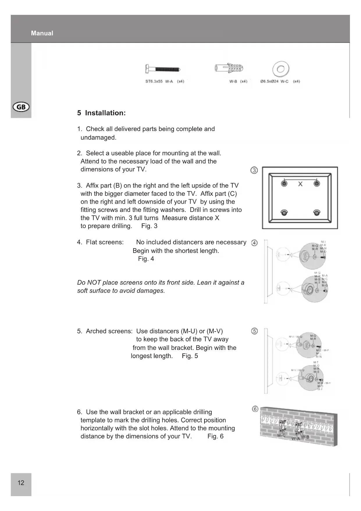 with the bigger diameter faced to the TV. Afx part (C) on the right and left downside of your TV by using the tting screws and the tting washers. Drill in screws into the TV with min. 3 full turns Measure distance X to prepare drilling. Fig. 3