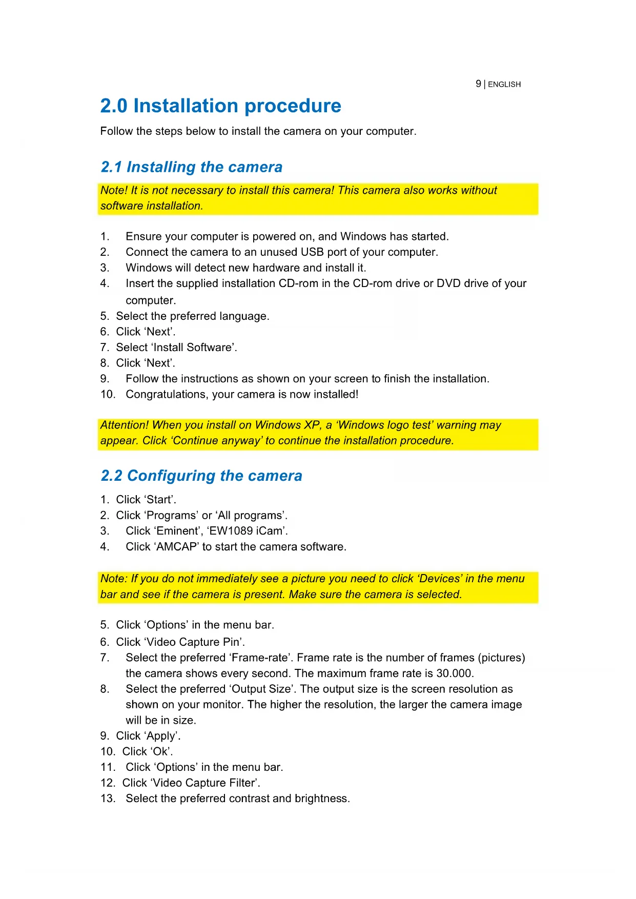 Note! It is not necessary to install this camera! This camera also works without software installation.