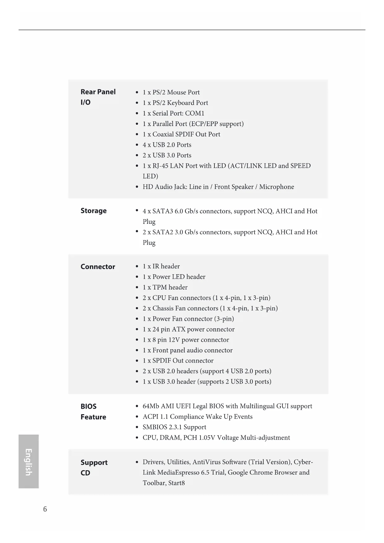 4 x SATA3 6.0 Gb/s connectors, support NCQ, AHCI and Hot