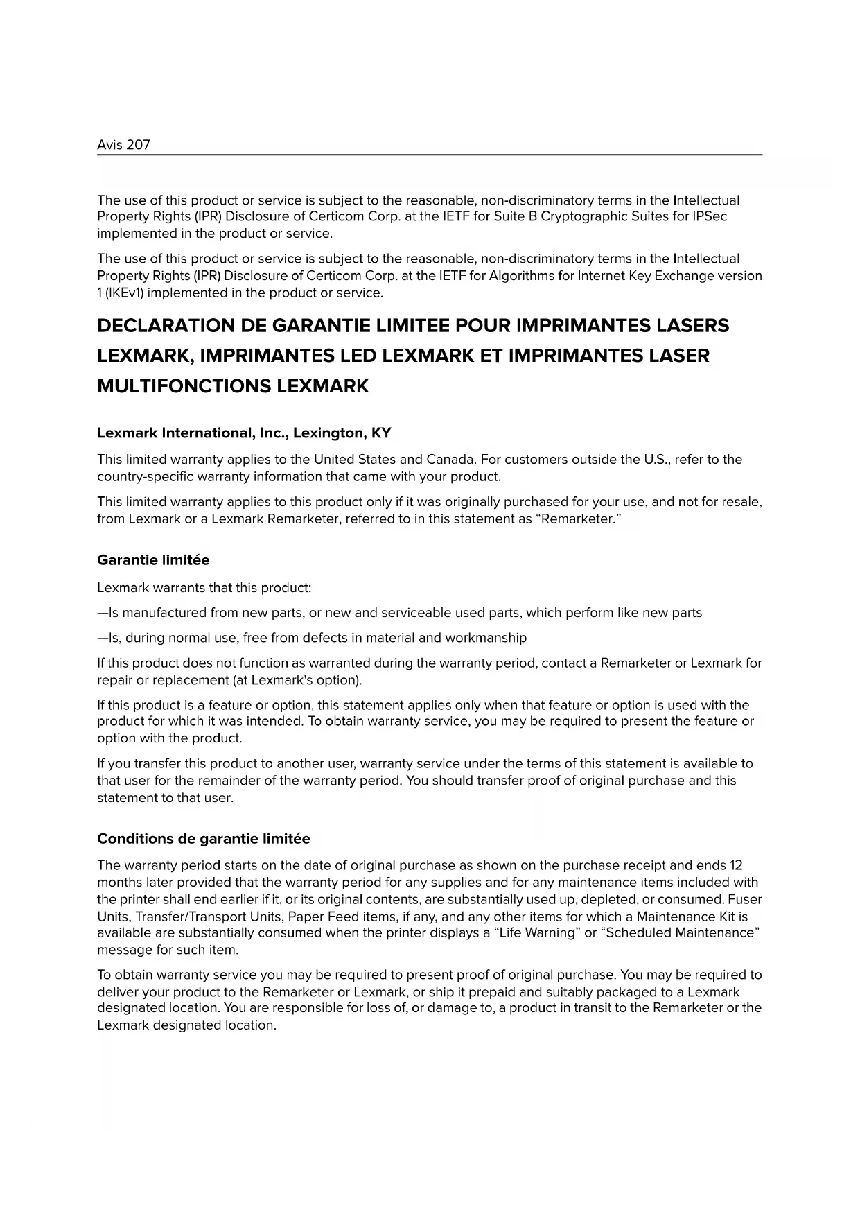 DECLARATION DE GARANTIE LIMITEE POUR IMPRIMANTES LASERS LEXMARK, IMPRIMANTES LED LEXMARK ET IMPRIMANTES LASER MULTIFONCTIONS LEXMARK Lexmark International, Inc., Lexington, KY This limited warranty applies to the United States and Canada. For customers outside the U.S., refer to the