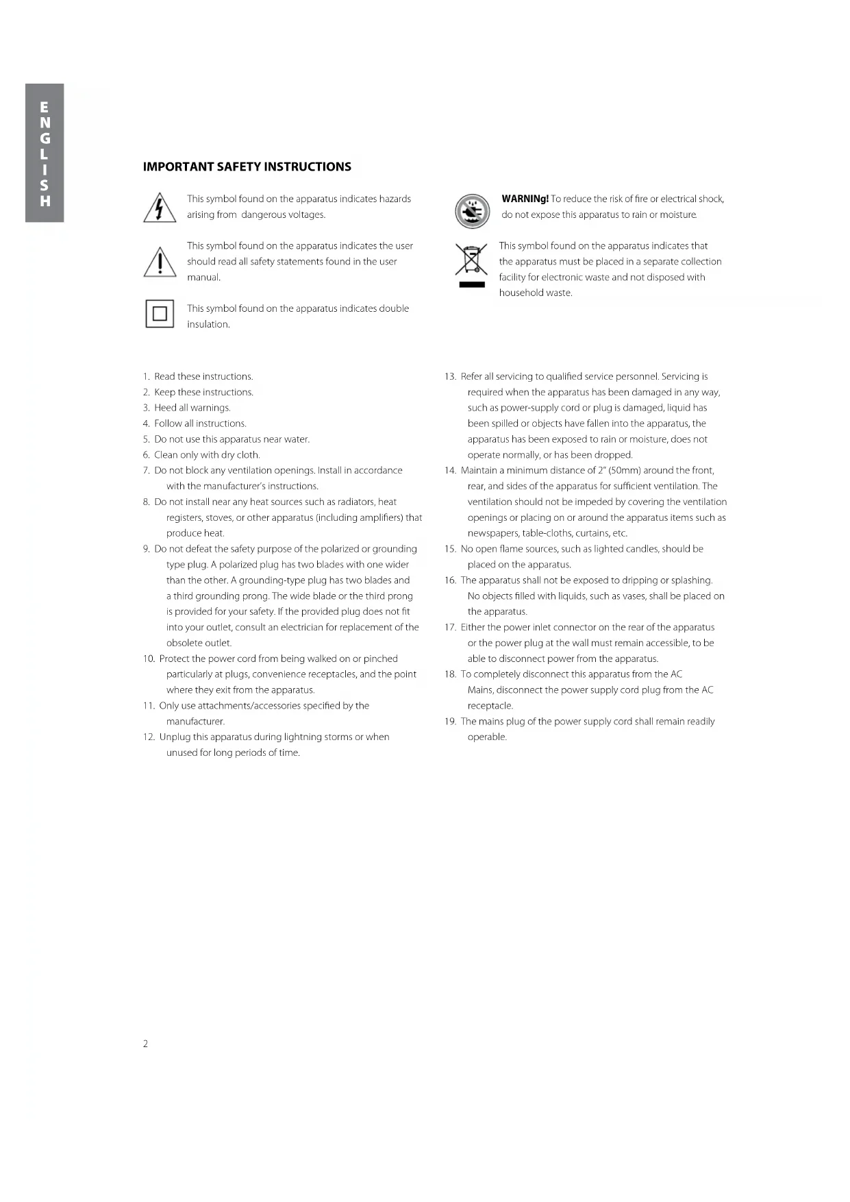 This symbol found on the apparatus indicates hazards arising from dangerous voltages. This symbol found on the apparatus indicates the user should read all safety statements found in the user manual. This symbol found on the apparatus indicates double insulation. WARNINg! To reduce the risk of fire or electrical shock, do not expose this apparatus to rain or moisture