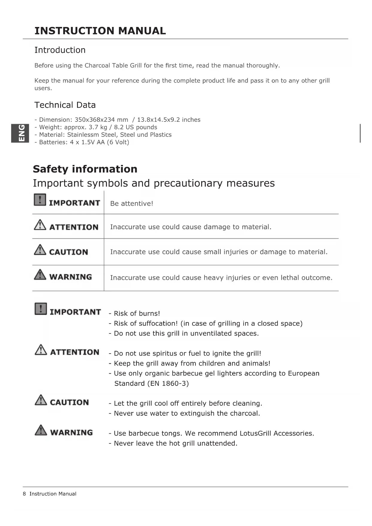 - Jede normale Holzkohle ist verwendbar. (Keine Briquettes)INSTRUCTION MANUAL 8 Instruction Manual - Risk of burns! - Risk of suffocation! (in case of grilling in a closed space) - Do not use this grill in unventilated spaces. - Do not use spiritus or fuel to ignite the grill! - Keep the grill away from children and animals! - Use only organic barbecue gel lighters according to European Standard (EN 1860-3) - Let the grill cool off entirely before cleaning. - Never use water to extinguish the charcoal. - Use barbecue tongs. We recommend LotusGrill Accessories. - Never leave the hot grill unattended. Be attentive! Inaccurate use could cause damage to material. Inaccurate use could cause heavy injuries or even lethal outcome. Inaccurate use could cause small injuries or damage to material. Important symbols and precautionary measures Safety information ENG Introduction Before using the Charcoal Table Grill for the rst time, read the manual thoroughly. Keep the manual for your reference during the complete product life and pass it on to any other grill users. Technical Data - Dimension: 350x368x234 mm / 13.8x14.5x9.2 inches - Weight: approx. 3.7 kg / 8.2 US pounds - Material: Stainlessm Steel, Steel und Plastics - Batteries: 4 x 1.5V AA (6 Volt)The LotusGrill may be used to grill meals using charcoal. Do not use this grill in unventi- lated spaces. All guidelines provided in this manual must be observed. The LotusGrill grill is intended for private use only! Intended Use Read the assembly instructions carefully and follow the safety information. Be sure to have enough time at your disposal. Create ample space. Remove grill from packaging! Assembly: General Information Secure handling and disposal of used batteries Please note: Only use commercially approved AA-batteries. Remember to dispose batteries properly according to local regulation, i.e. at a battery collection point. Batteries may not be disposed with domestic waste. English 9 Proper disposal of charcoal Dispose charcoal in proper non-combustible or metal containers only. Do not dispose in plastic or inammable containers. Environmentally friendly disposal of electrical equipment Please dispose your old grill at proper collection points, which the manufacturer can point out to you at request. Do not dispose your old device with domestic waste. Safety information ENGThe LotusGrill has a 2-years-warranty from date of purchase against manufacturing defects, given that it was used according to instructions of use. For proof of warranty, please retain your sales receipt with indicated date of purchase. Abrasion, rust, deformation or staining of parts exposed directly to ame (especially stainless steel parts) are normal wear after use and are under no circumstance considered to be manufacturing defects. Warranty Check list of components and chart to make sure all items are included in delivery: - Remove the pre-assembled grill grid and charcoal container. - Take off packaging. Assembly: Preparation The Charcoal Container may contain a thin oil lm on the metal net, due to its production process. This oil can cause smoke only in the rst use. First Use 10 Instruction Manual Maintenance and Storage The grill must cool off completely before cleaning. Do not use water to cool off the hot grill. Burns and scalding might occur. Clean grill grid, inner bowl and other dirty parts after each use. The grill must cool off entirely before cleaning, otherwise burning injuries might occur. Grill grid and inner bowl are dishwasher safe or can be cleaned with standard washing-up liquid. Clean outer bowl (containing electronic unit) only with wet cloth or brush. Do not use acidic, solvent or other ammable liquids. Remove batteries during a longer period of storage. The charcoal container is a wear part and should be exchanged occasionally. ENGAssembly