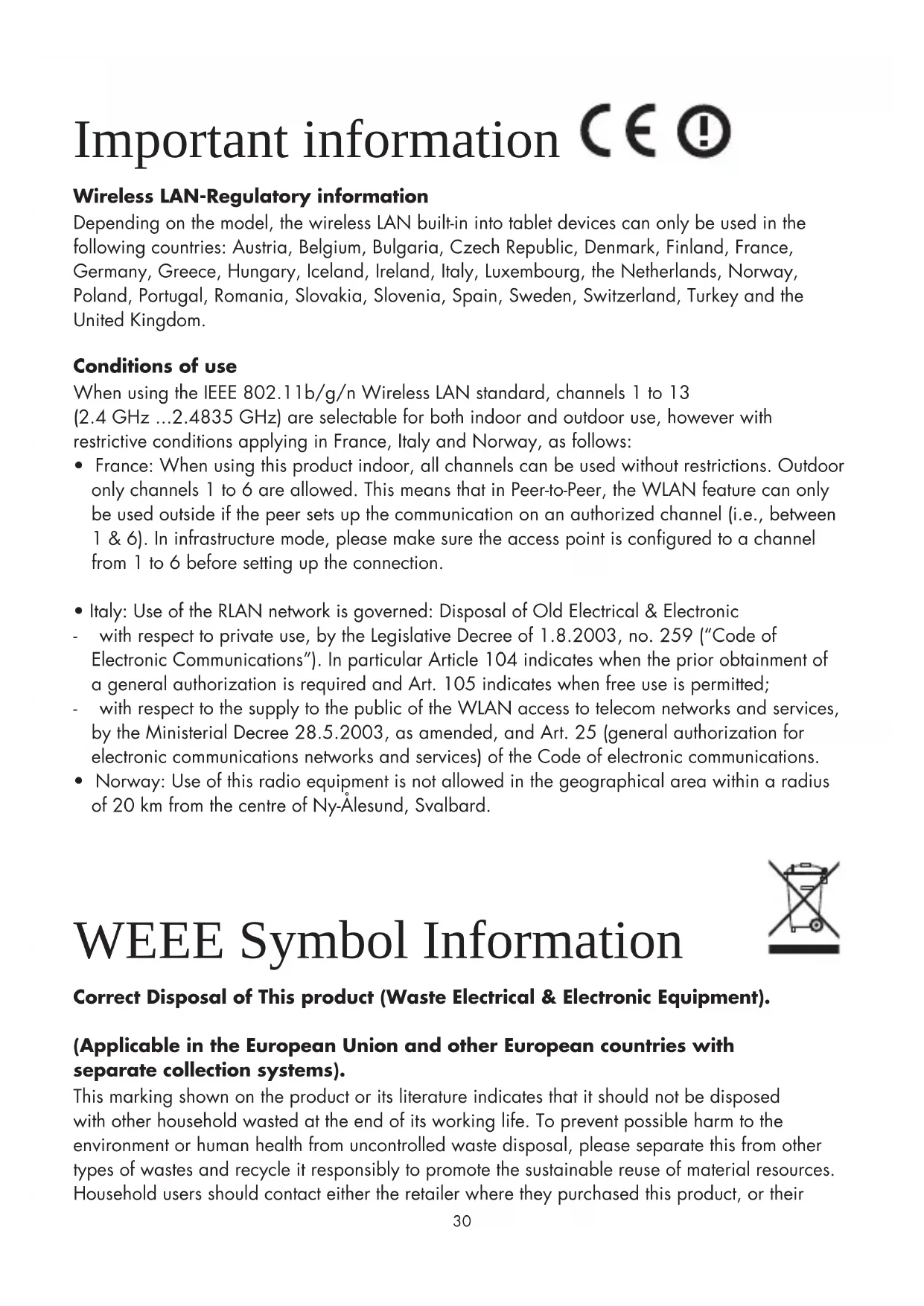 - Warning: We strongly advise to connect this device to a earthed wall socket when charging. TAB07_485_QSG_.indd 30 29-07-13 09:4831 Important information Wireless LAN-Regulatory information Depending on the model, the wireless LAN built-in into tablet devices can only be used in the following countries: Austria, Belgium, Bulgaria, Czech Republic, Denmark, Finland, France, Germany, Greece, Hungary, Iceland, Ireland, Italy, Luxembourg, the Netherlands, Norway, Poland, Portugal, Romania, Slovakia, Slovenia, Spain, Sweden, Switzerland, Turkey and the United Kingdom. Conditions of use When using the IEEE 802.11b/g/n Wireless LAN standard, channels 1 to 13 (2.4 GHz ...2.4835 GHz) are selectable for both indoor and outdoor use, however with restrictive conditions applying in France, Italy and Norway, as follows:
