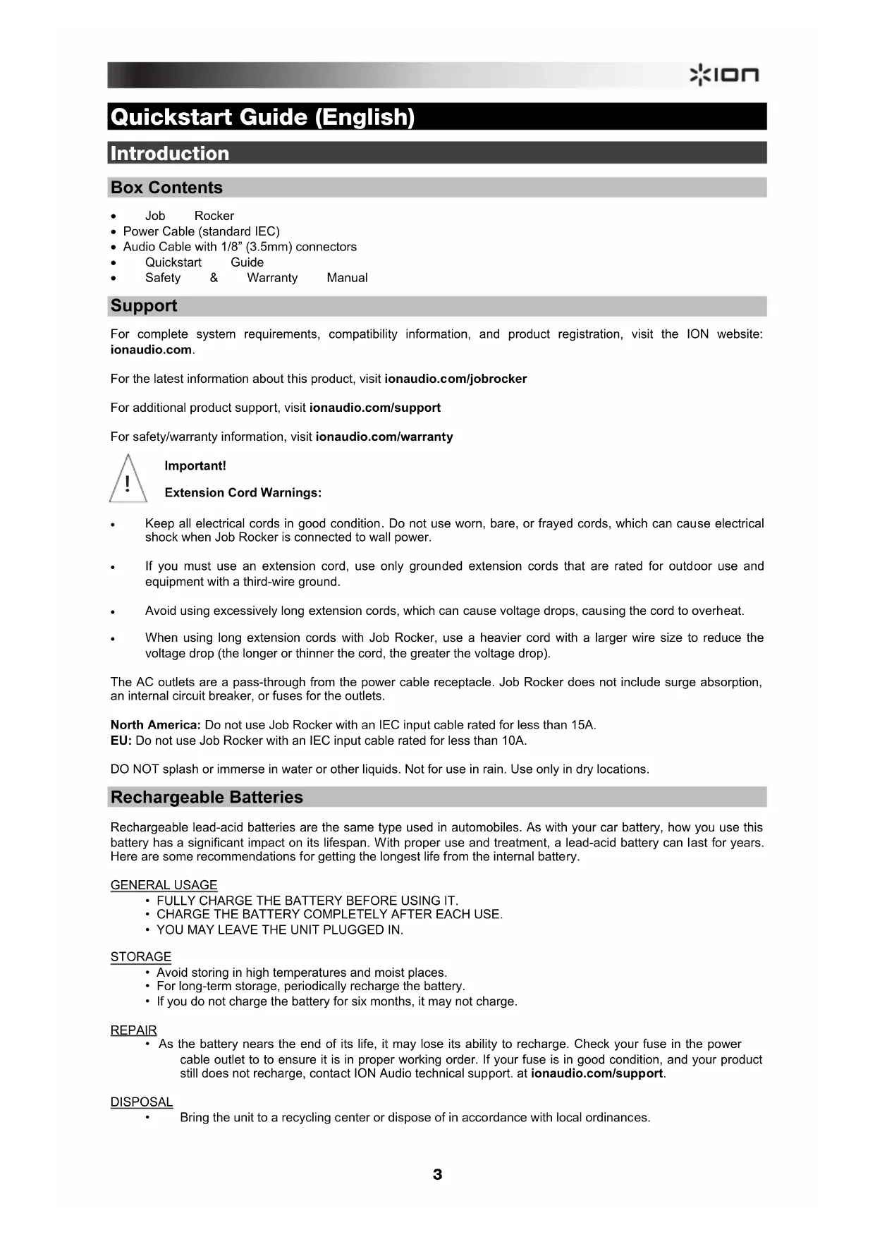 - Job Rocker • Power Cable (standard IEC) • Audio Cable with 1/8” (3.5mm) connectors • Quickstart Guide • Safety & Warranty Manual Support For complete system requirements, compatibility information, and product registration, visit the ION website: ionaudio.com. For the latest information about this product, visit ionaudio.com/jobrocker For additional product support, visit ionaudio.com/support For safety/warranty information, visit ionaudio.com/warranty Important! Extension Cord Warnings: