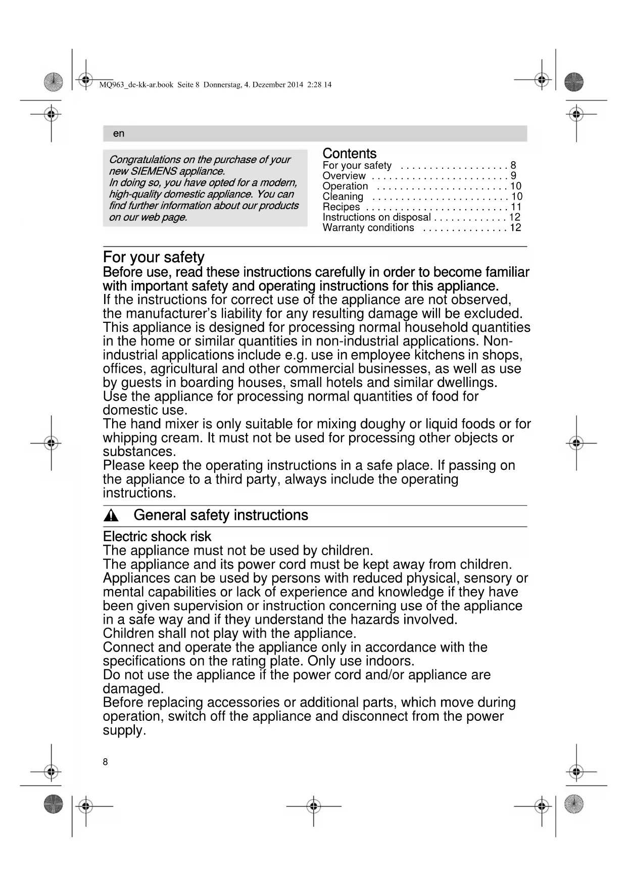 Contents For your safety . . . . . . . . . . . . . . . . . . . 8Overview . . . . . . . . . . . . . . . . . . . . . . . . 9Operation . . . . . . . . . . . . . . . . . . . . . . . 10Cleaning . . . . . . . . . . . . . . . . . . . . . . . . 10Recipes . . . . . . . . . . . . . . . . . . . . . . . . . 11Instructions on disposal . . . . . . . . . . . . . 12Warranty conditions . . . . . . . . . . . . . . . 12 For your safety