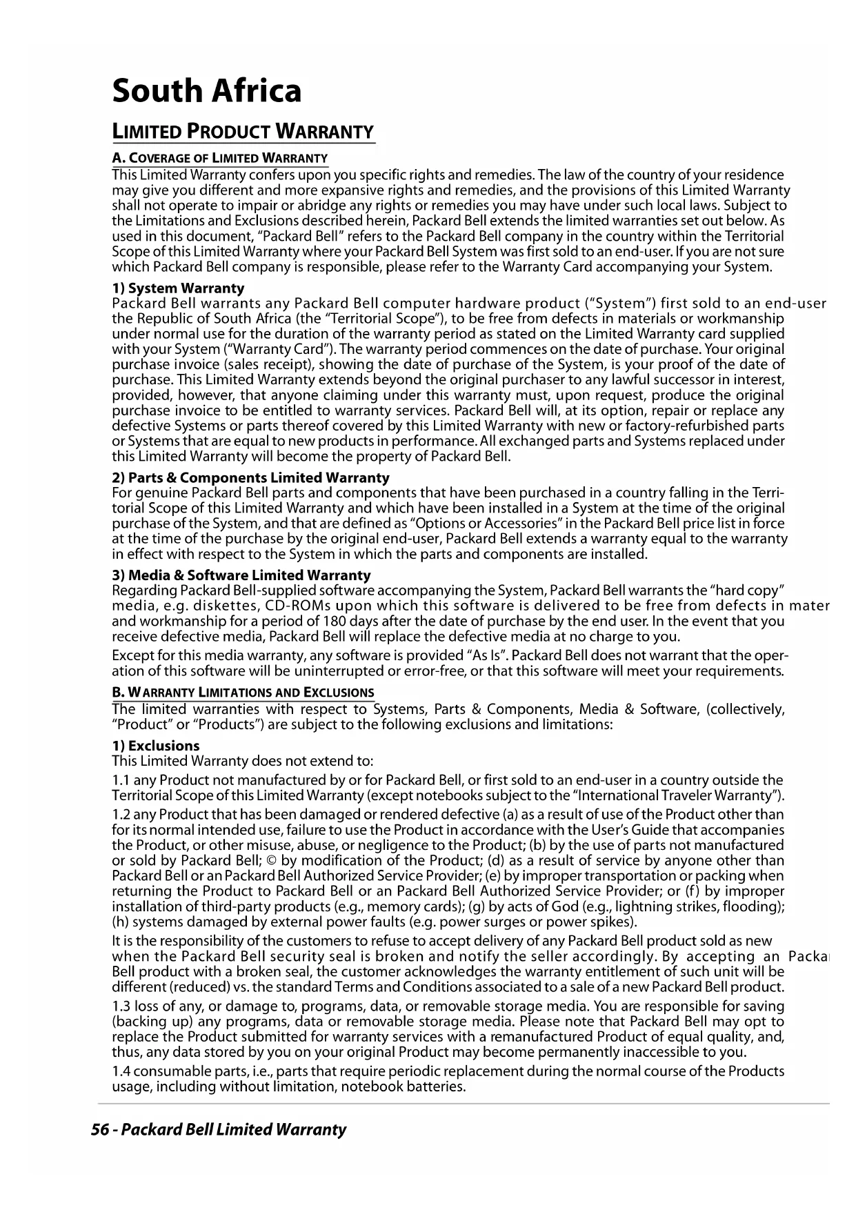 the Limitations and Exclusions described herein, Packard Bell extends the limited warranties set out below. As