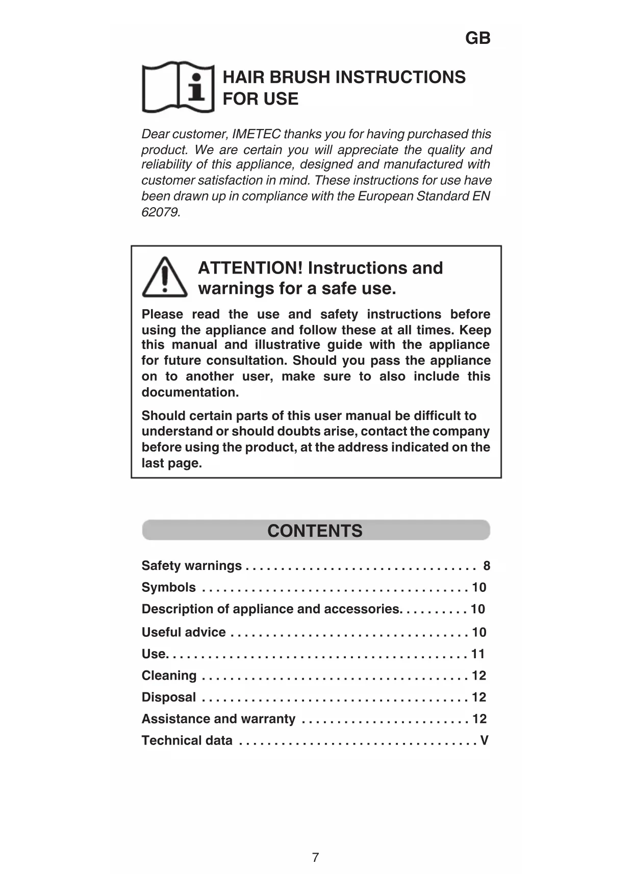 MI001123.indd 6 21/02/13 22.55HAIR BRUSH INSTRUCTIONS FOR USE Dear customer, IMETEC thanks you for having purchased this