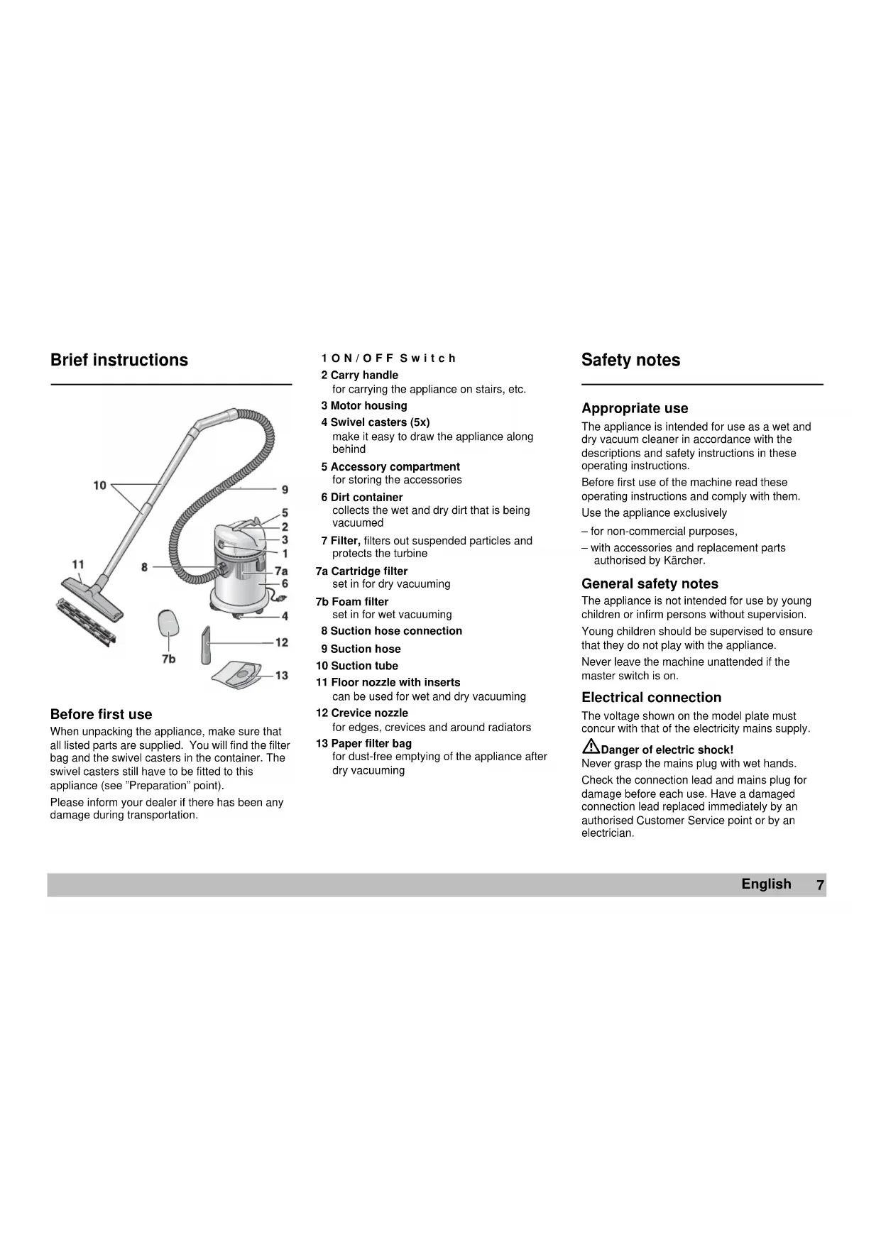 English When using the machine in wet rooms, e.g. in the bathroom, only connect it to sockets which are connected in series with a ground fault circuit interrupter. In case of doubt, consult an electrician. Danger of explosion! Never use to appliance to vacuum explosive liquids, flammable gases, explosive dusts, or undiluted acids or solvents! These include petrol, paint thinner, and heating oil, which may form explosive vapours or mixtures when agitated by the suction air. This applies equally to acetone, undiluted acids and solvents, and aluminium and magnesium dusts. Furthermore, these substances may cause appliance materials to corrode.Do not use the appliance to vacuum burning or smouldering objects.When using the appliance in areas of potential risk (e.g. filling stations), the pertinent safety guidelines must be observed. It is not permitted to use the appliance in potentially explosive locations. Environmental protection Disposal of packagingThe packaging is recyclable. Please dispose of it at a recycling facility.Disposing of the applianceYou can obtain information about environmentally correct disposal from your Kärcher dealer. Operating the cleaner