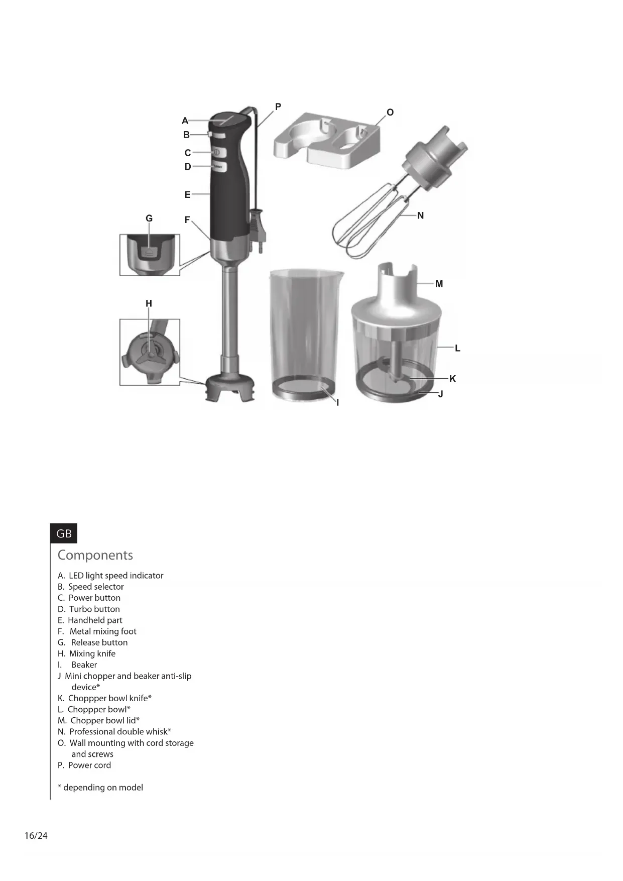 J Mini chopper and beaker anti-slip device* K. Choppper bowl knife* L. Choppper bowl* M. Chopper bowl lid* N. Professional double whisk* O. Wall mounting with cord storage and screws P. Power cord
