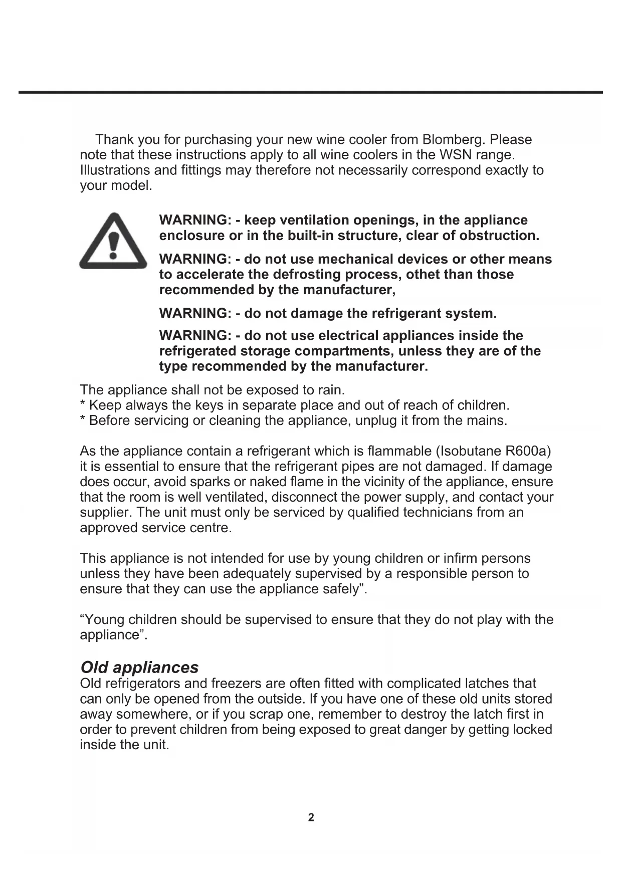 - Before servicing or cleaning the appliance, unplug it from the mains. As the appliance contain a refrigerant which is flammable (Isobutane R600a) it is essential to ensure that the refrigerant pipes are not damaged. If damage does occur, avoid sparks or naked flame in the vicinity of the appliance, ensure that the room is well ventilated, disconnect the power supply, and contact your supplier. The unit must only be serviced by qualified technicians from an approved service centre. This appliance is not intended for use by young children or infirm persons unless they have been adequately supervised by a responsible person to ensure that they can use the appliance safely”. “Young children should be supervised to ensure that they do not play with the appliance”. Old appliances Old refrigerators and freezers are often fitted with complicated latches that can only be opened from the outside. If you have one of these old units stored away somewhere, or if you scrap one, remember to destroy the latch first in order to prevent children from being exposed to great danger by getting locked inside the unit.3 Before use Before operating your new appliance, please read the following instructions carefully as they contain important information on safety, installation, operation and maintenance. Keep the instructions for future reference. On receipt, check to ensure that the appliance has not been damaged during transport. Transport damage should be reported to the local distributor before the wine cooler is put to use. Remove the packaging. Clean the inside of the cabinet using warm water with a mild detergent. Rinse with clean water and dry thoroughly (see cleaning instructions). Use a soft cloth. If during transport the appliance has been laid down, or if it has been stored in cold surroundings (colder than +5°C), it must be allowed to stabilise in an upright position for at least an hour before being switched on. Get to know your wine cooler Lighting Charcoal filter Wooden shelf Sealing strip Nameplate Door handle Kick plate Control panel Lock Adjustable feet Fig. 14 Placement For safety and operational reasons, the appliance must not be installed outdoors. The appliance should be placed on a level surface in a dry, well ventilated room (max.75% relative air humidity). Never place the appliance close to sources of heat such as cookers or radiators, and avoid placing it in direct sunlight. Room temperature The climate class is stated on the nameplate (see fig. 1 on page 3 and fig. 11 on page 13). This specifies the optimum room temperature. Wine coolers with winter position, however, function at room temperatures as low as 5ºC. Installation The surface on which the appliance is to be placed must be level. Do not use a frame or similar. The appliance can be installed as a freestanding unit against a wall, built into a kitchen element, or lined up with other appliances (figs 2-3). Installation and start-up