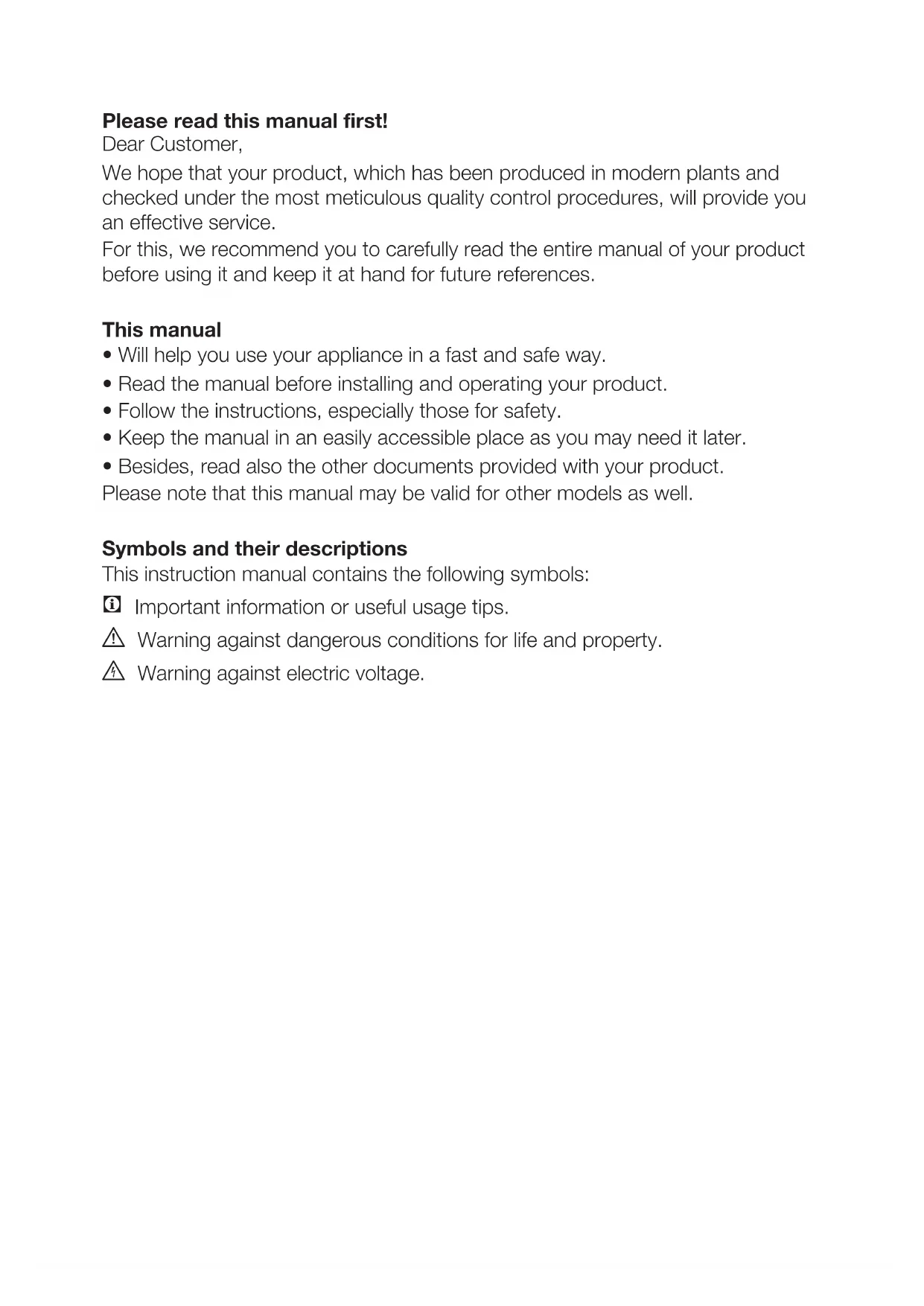 - Besides, read also the other documents provided with your product. Please note that this manual may be valid for other models as well. Symbols and their descriptions This instruction manual contains the following symbols: C Important information or useful usage tips. A Warning against dangerous conditions for life and property. B Warning against electric voltage.EN