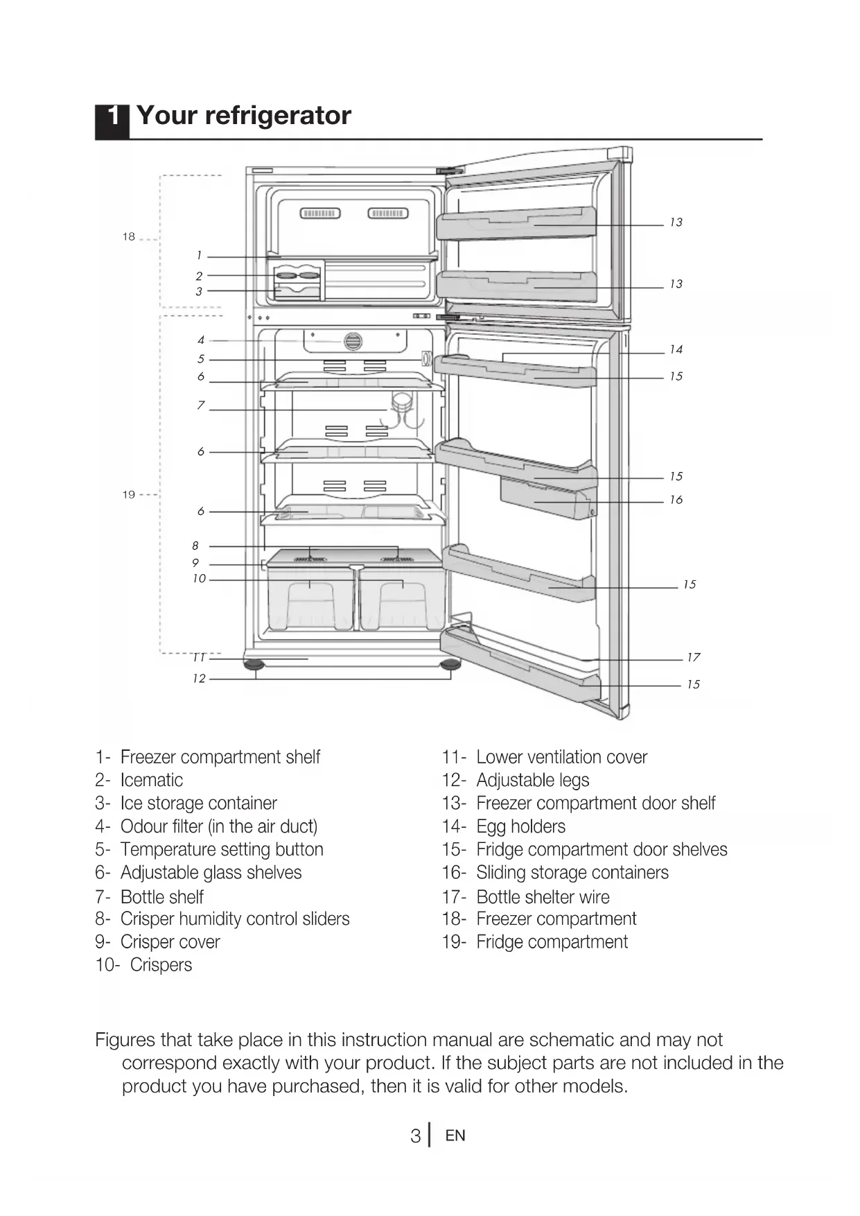 Figures that take place in this instruction manual are schematic and may not correspond exactly with your product. If the subject parts are not included in the product you have purchased, then it is valid for other models. 1 Your refrigerator
