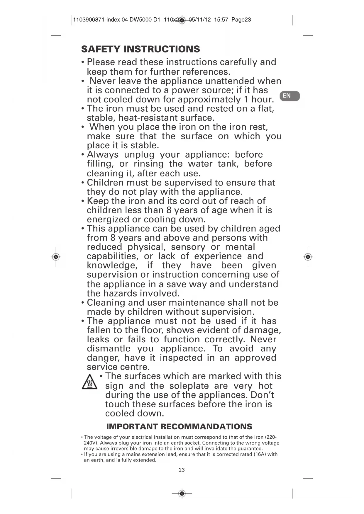 - The surfaces which are marked with this sign and the soleplate are very hot during the use of the appliances. Don’t touch these surfaces before the iron is cooled down. IMPORTANT RECOMMANDATIONS
