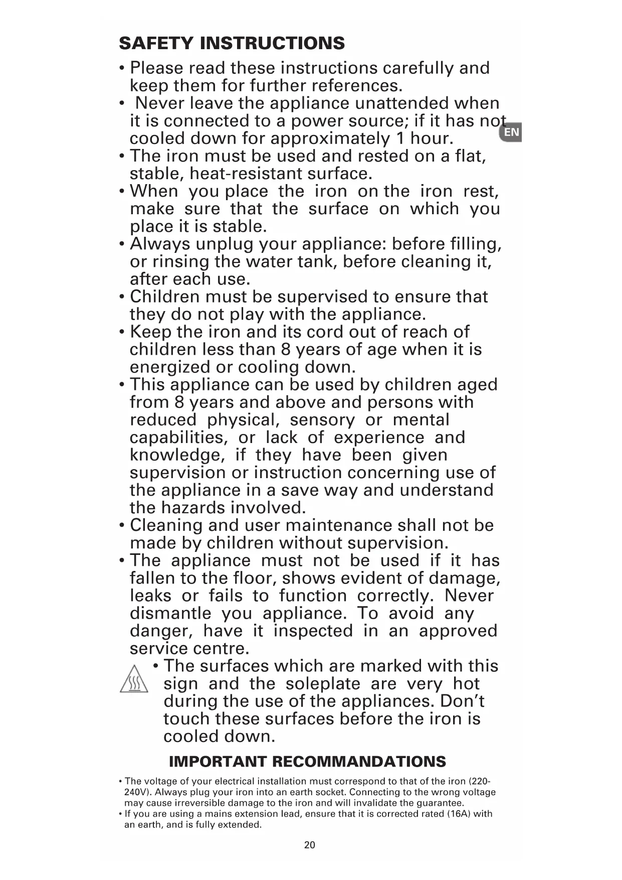 • The voltage of your electrical installation must correspond to that of the iron (220-