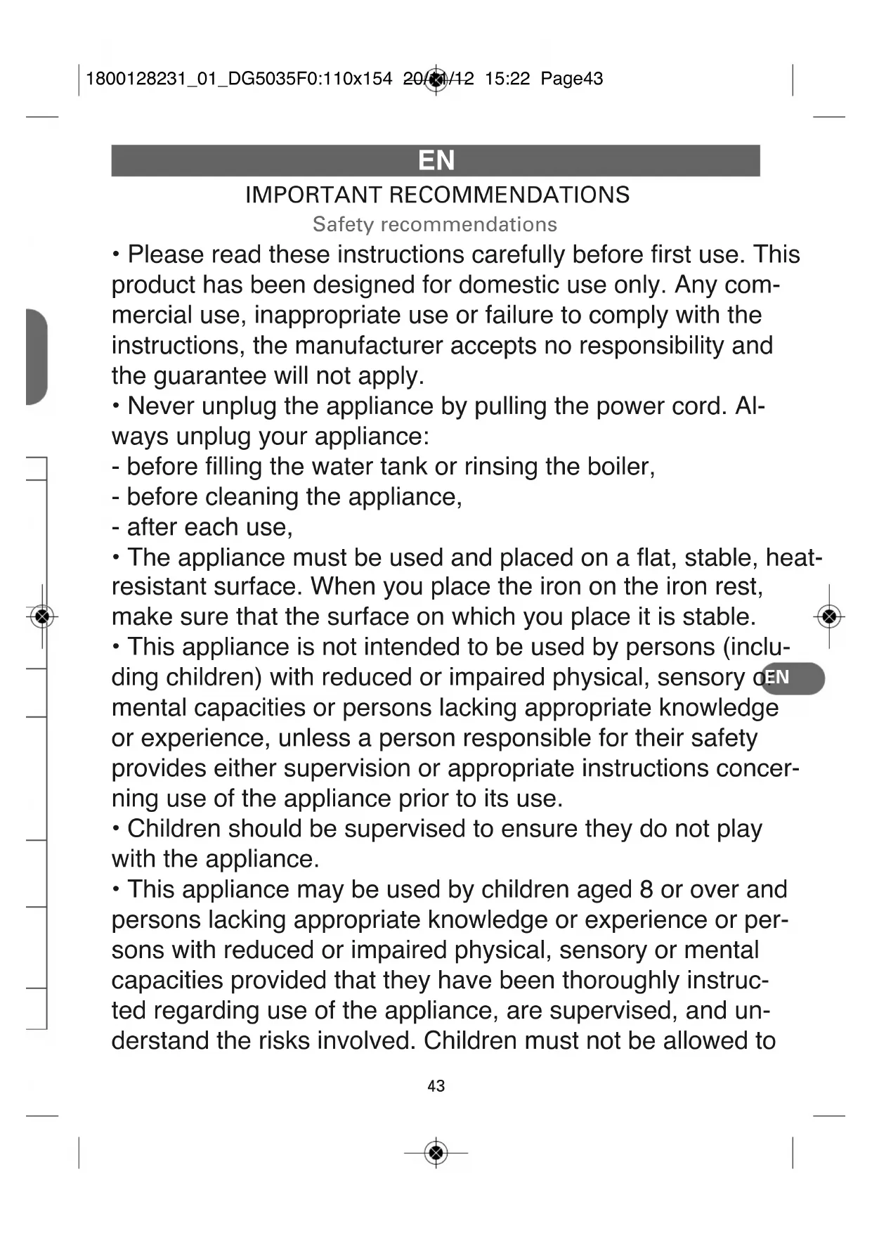 Download the instructions for your Iron in PDF format for free! Find your manual DG5035 - ROWENTA and take your electronic device back in hand. On this page are published all the documents necessary for the use of your device. DG5035 by ROWENTA.